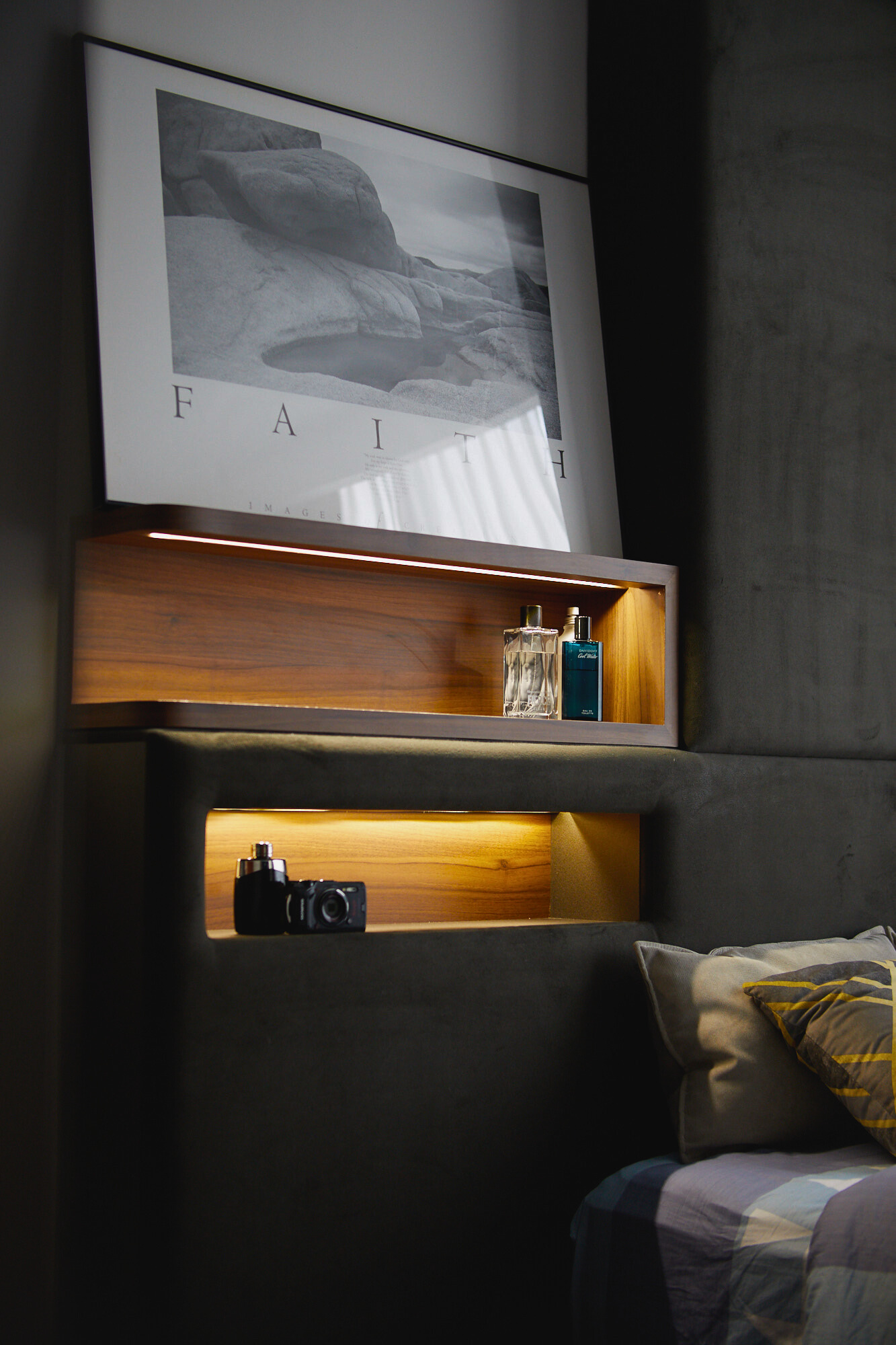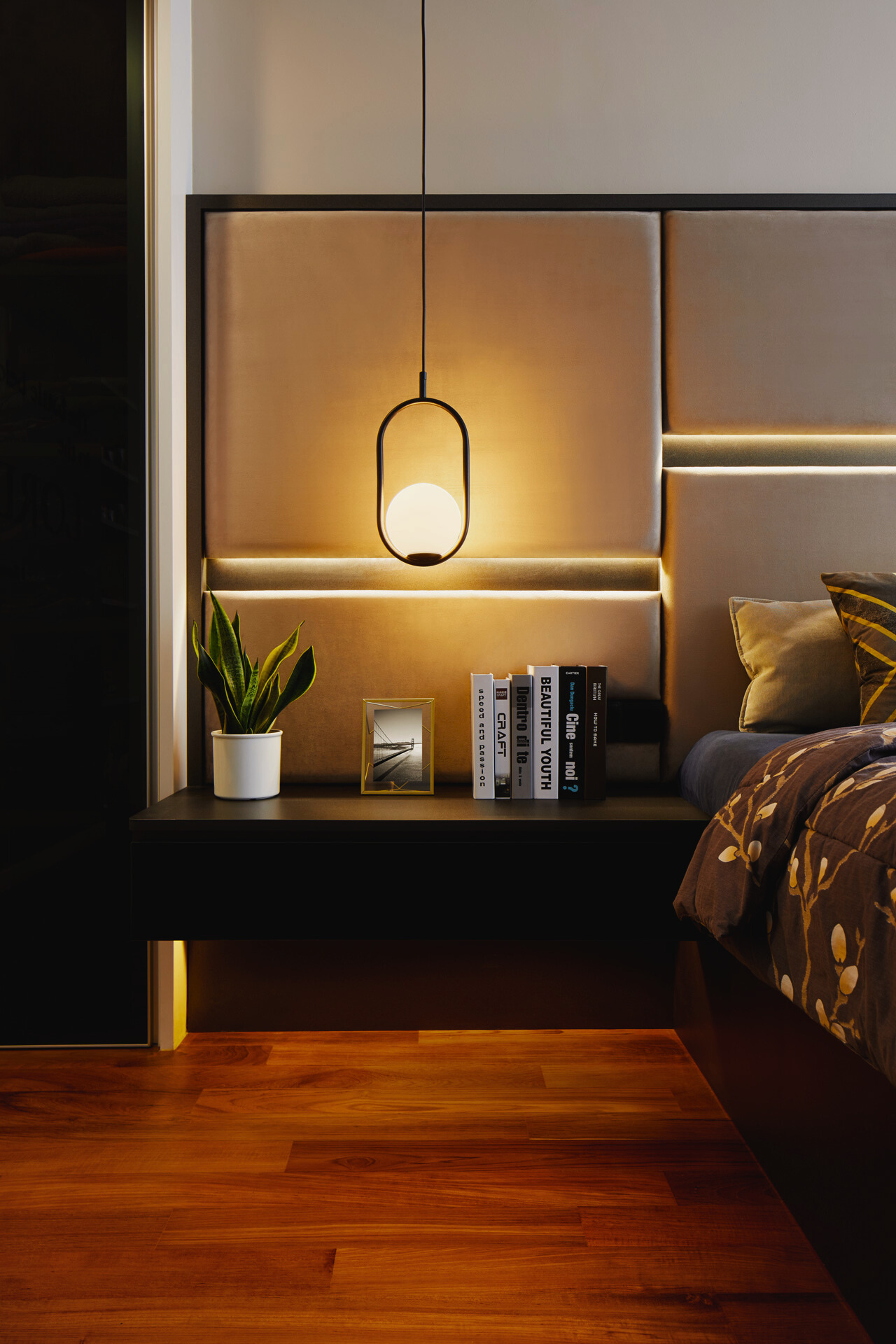 In the private spaces, bespoke headboards, tailored lighting and integrated carpentry bring hotel-like refinement to the bedrooms. Built-in niches, ambient LED details and curated décor offer both function and quiet personality. Every design choice leans toward comfort, serenity and understated luxury, shaping a home that feels intimate, timeless and beautifully composed.