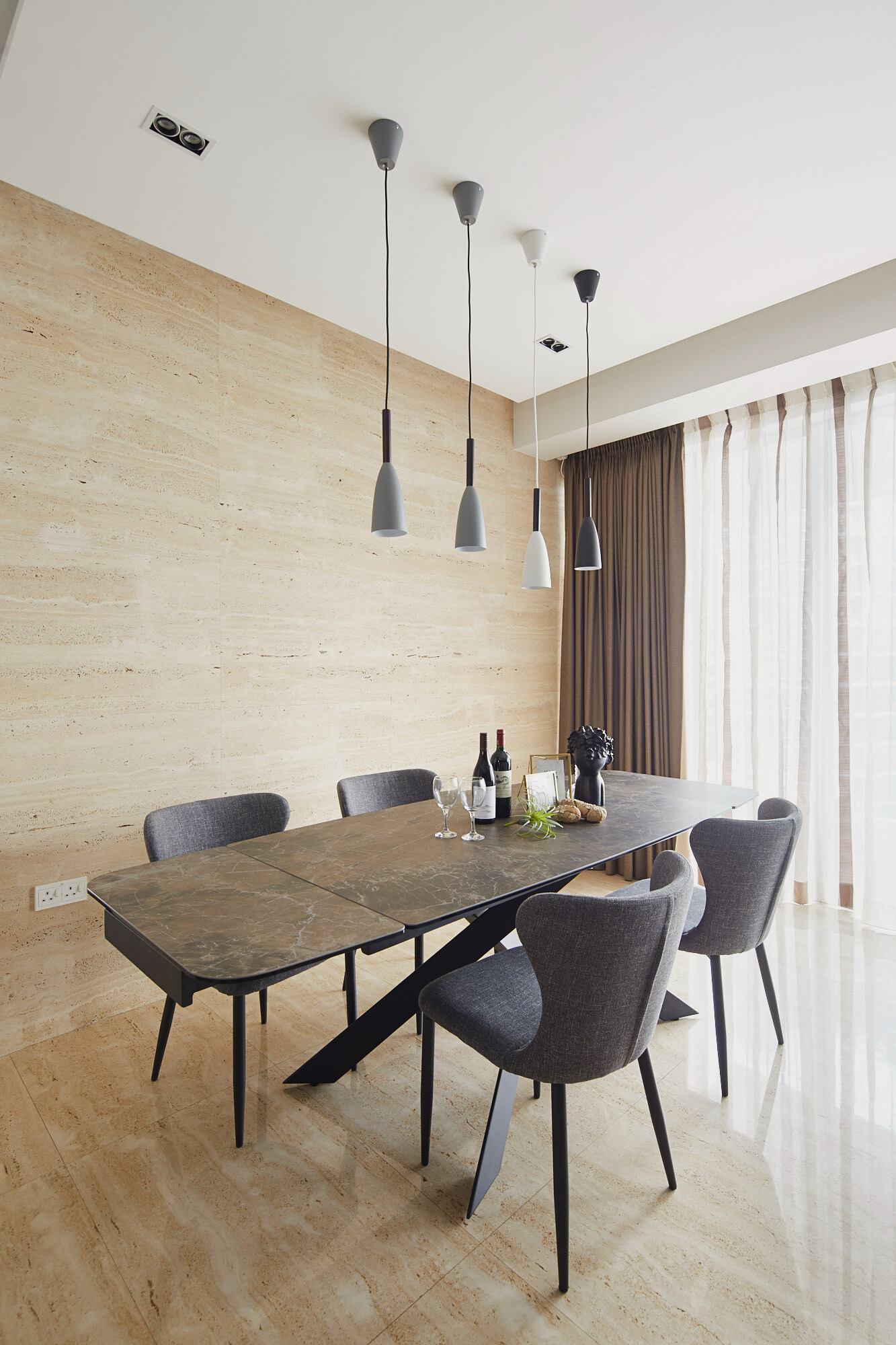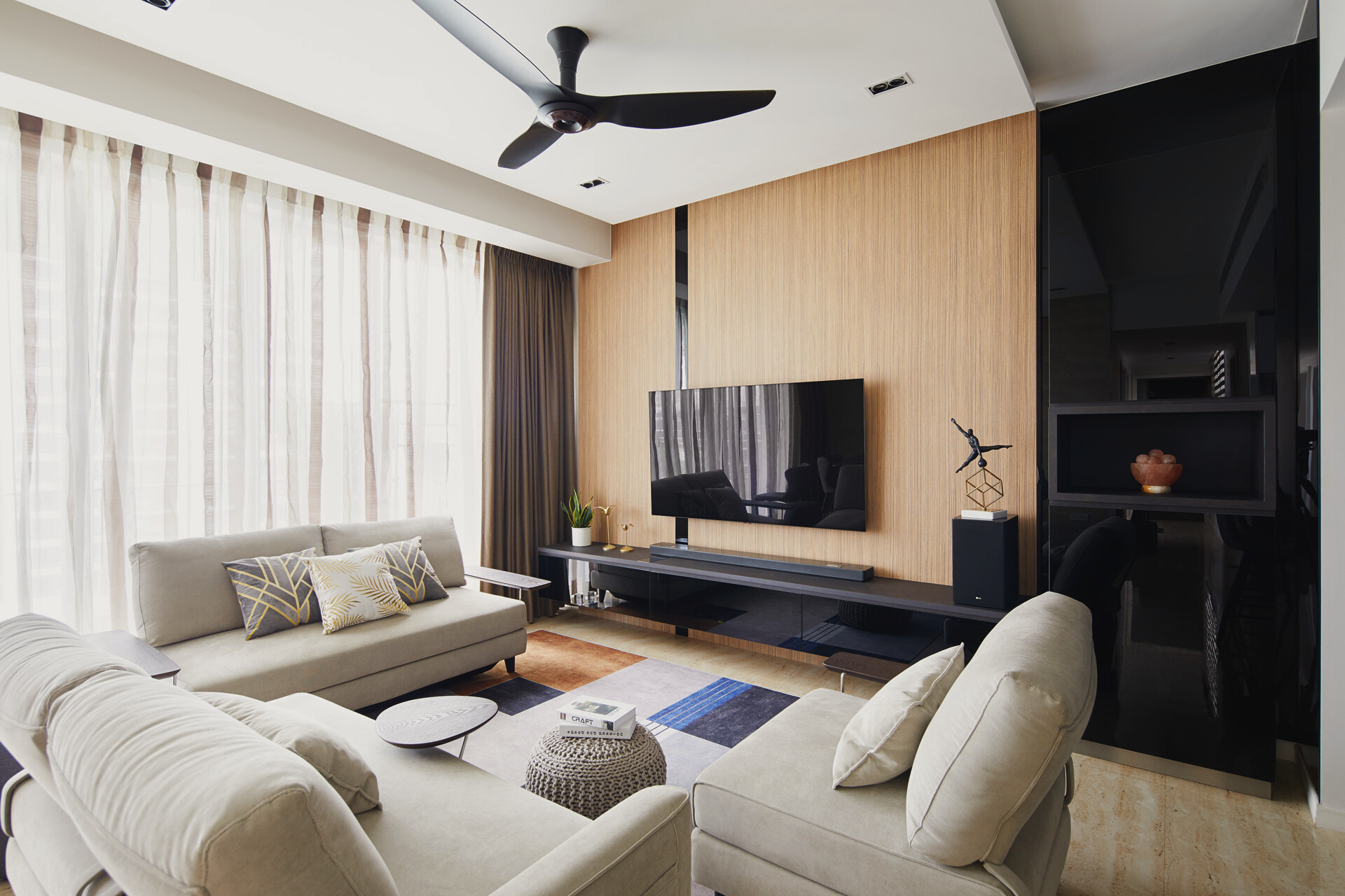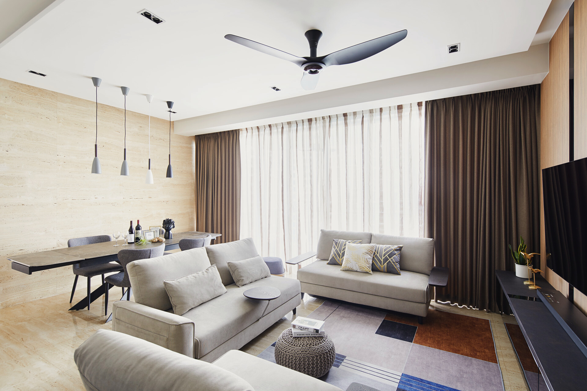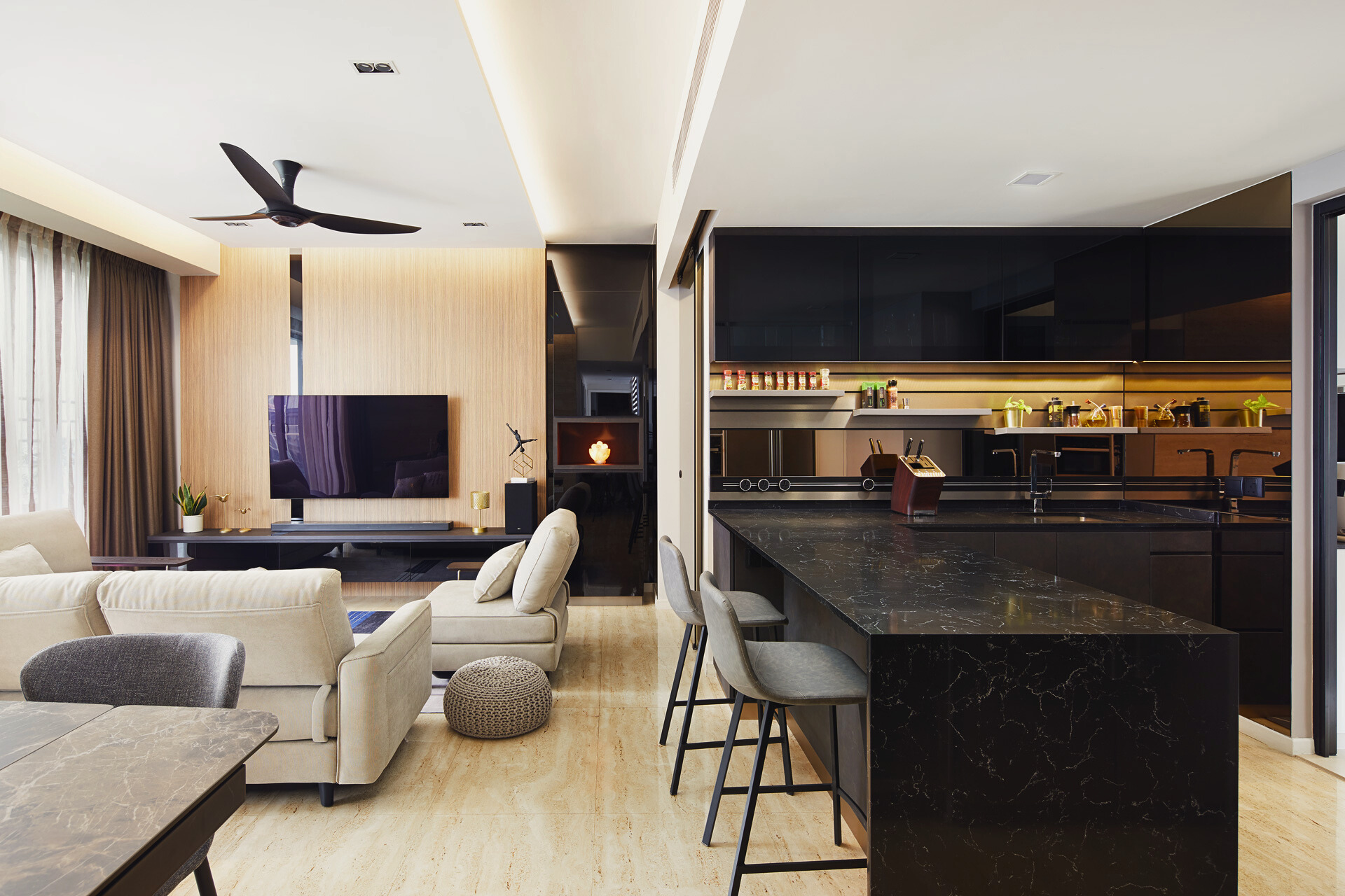 The layout emphasises flow and openness, with the living, dining and kitchen zones connected through a cohesive palette of wood, black accents and soft lighting. Gentle contrasts—sheer curtains against dark cabinetry, sculptural pendants above travertine stone, and plush seating framed by clean architectural lines—add visual depth without overwhelming the senses. The result is a home that breathes and feels effortlessly balanced.