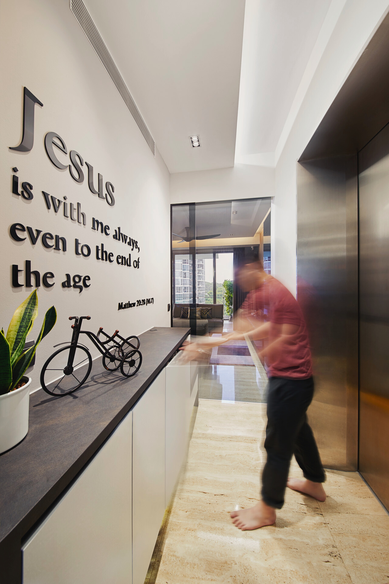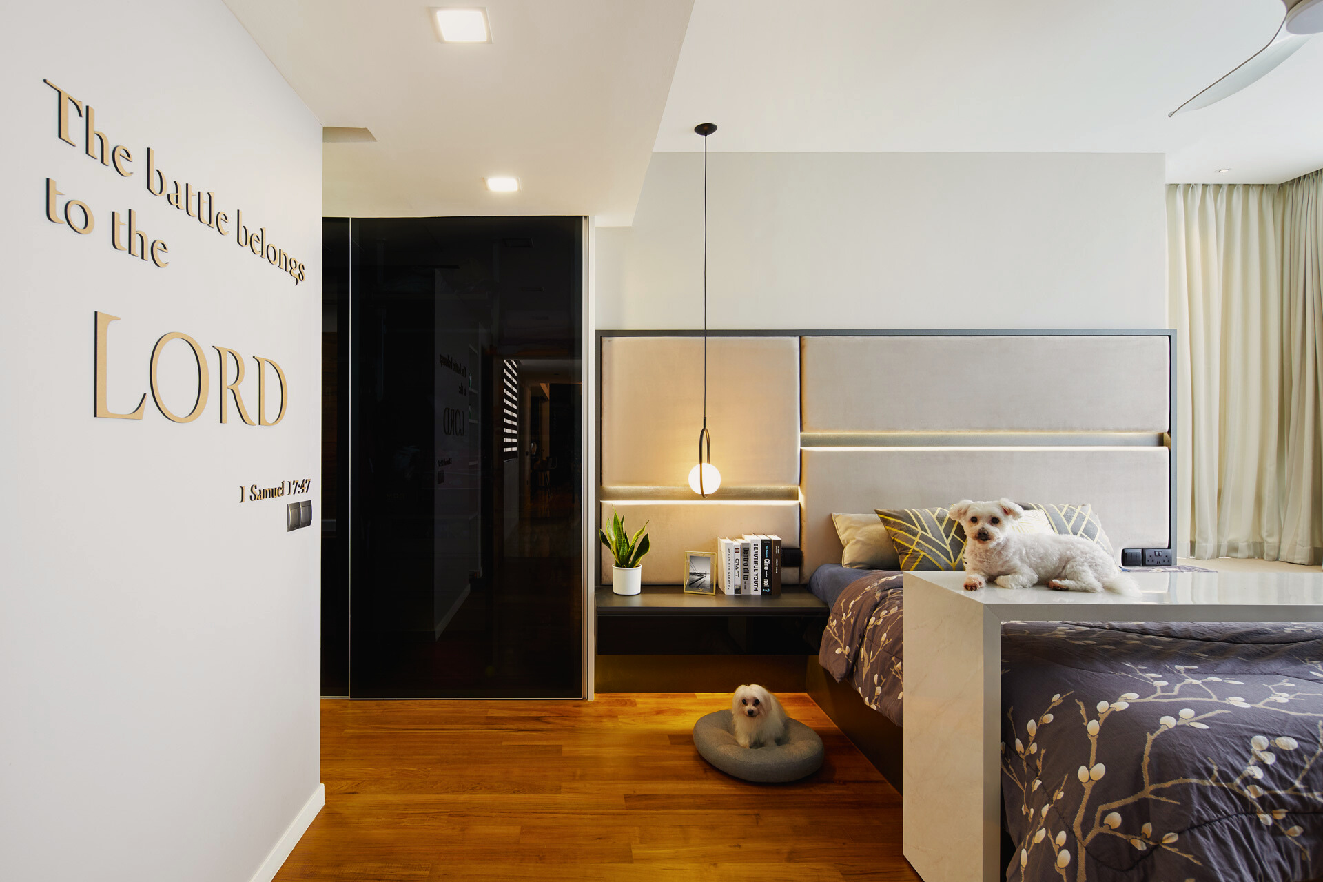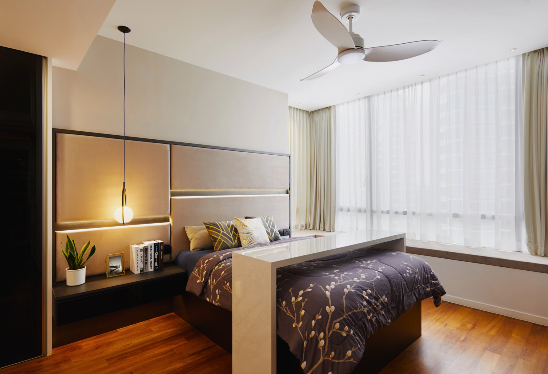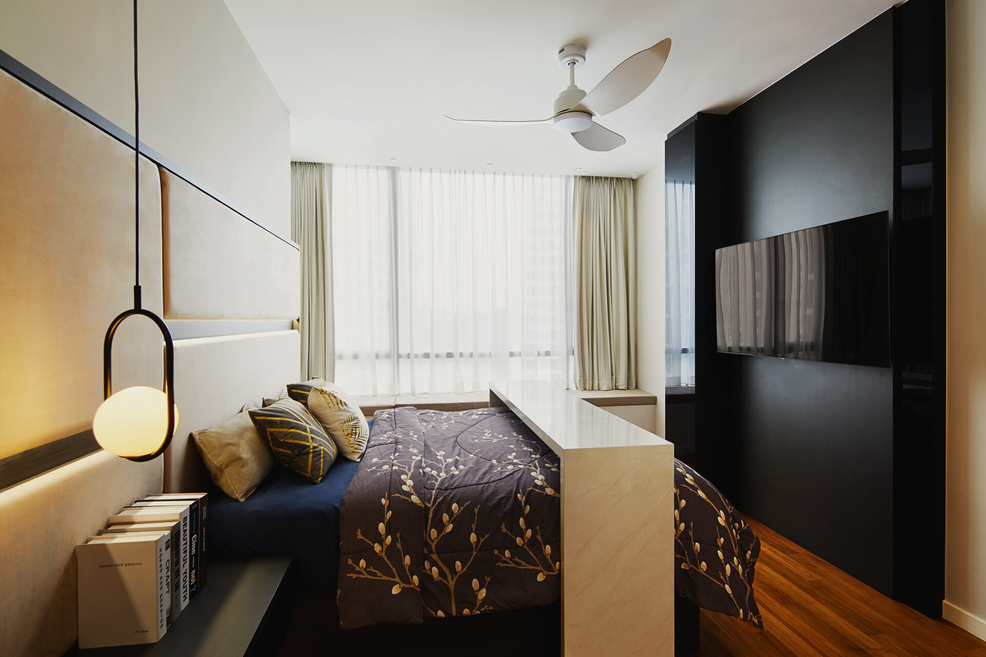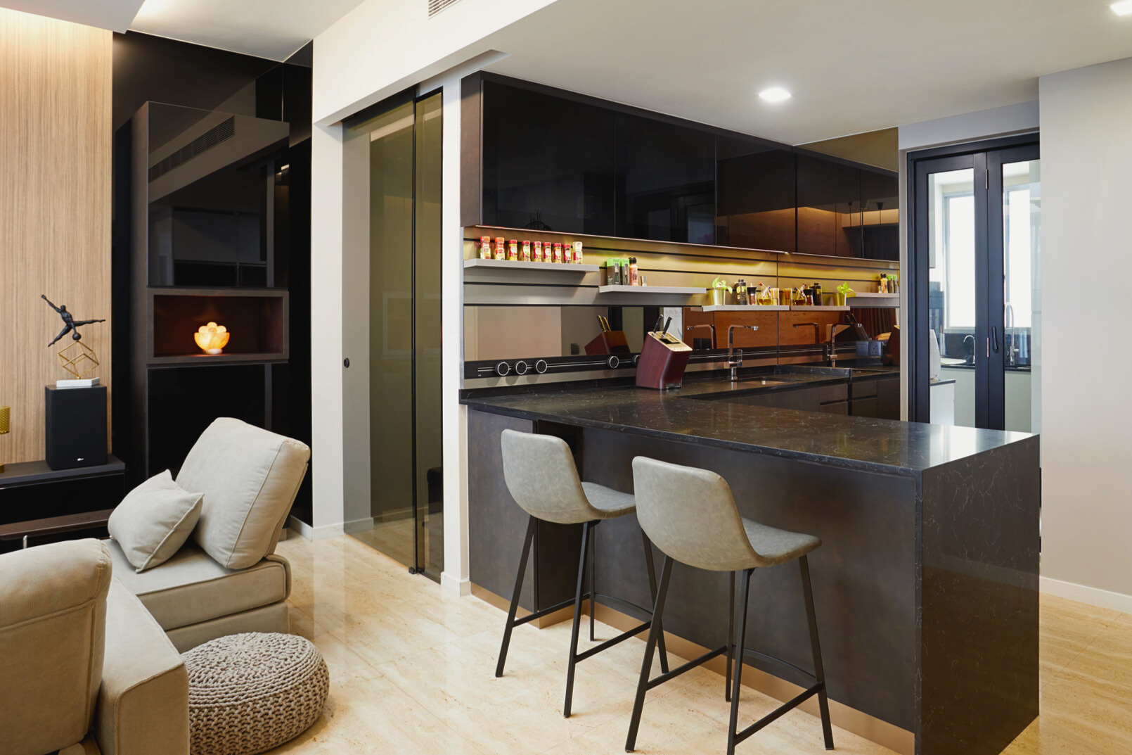 The layout emphasises flow and openness, with the living, dining and kitchen zones connected through a cohesive palette of wood, black accents and soft lighting. Gentle contrasts—sheer curtains against dark cabinetry, sculptural pendants above travertine stone, and plush seating framed by clean architectural lines—add visual depth without overwhelming the senses. The result is a home that breathes and feels effortlessly balanced.