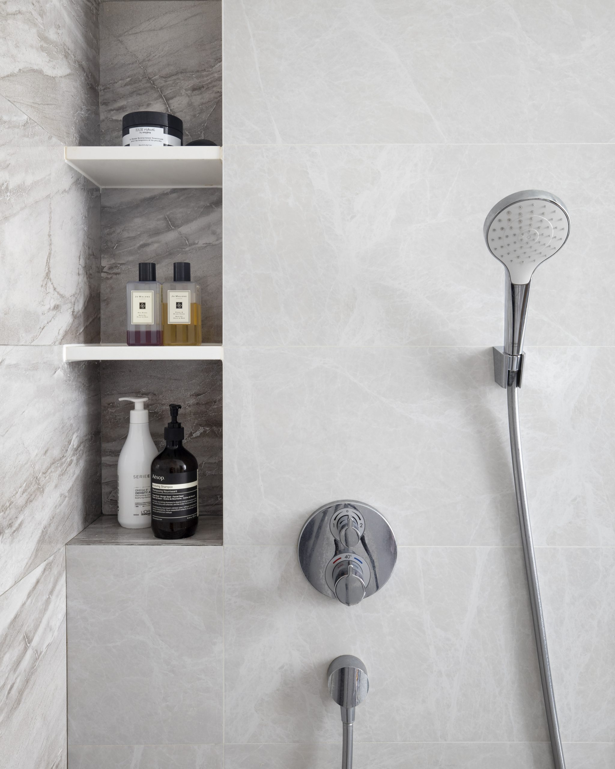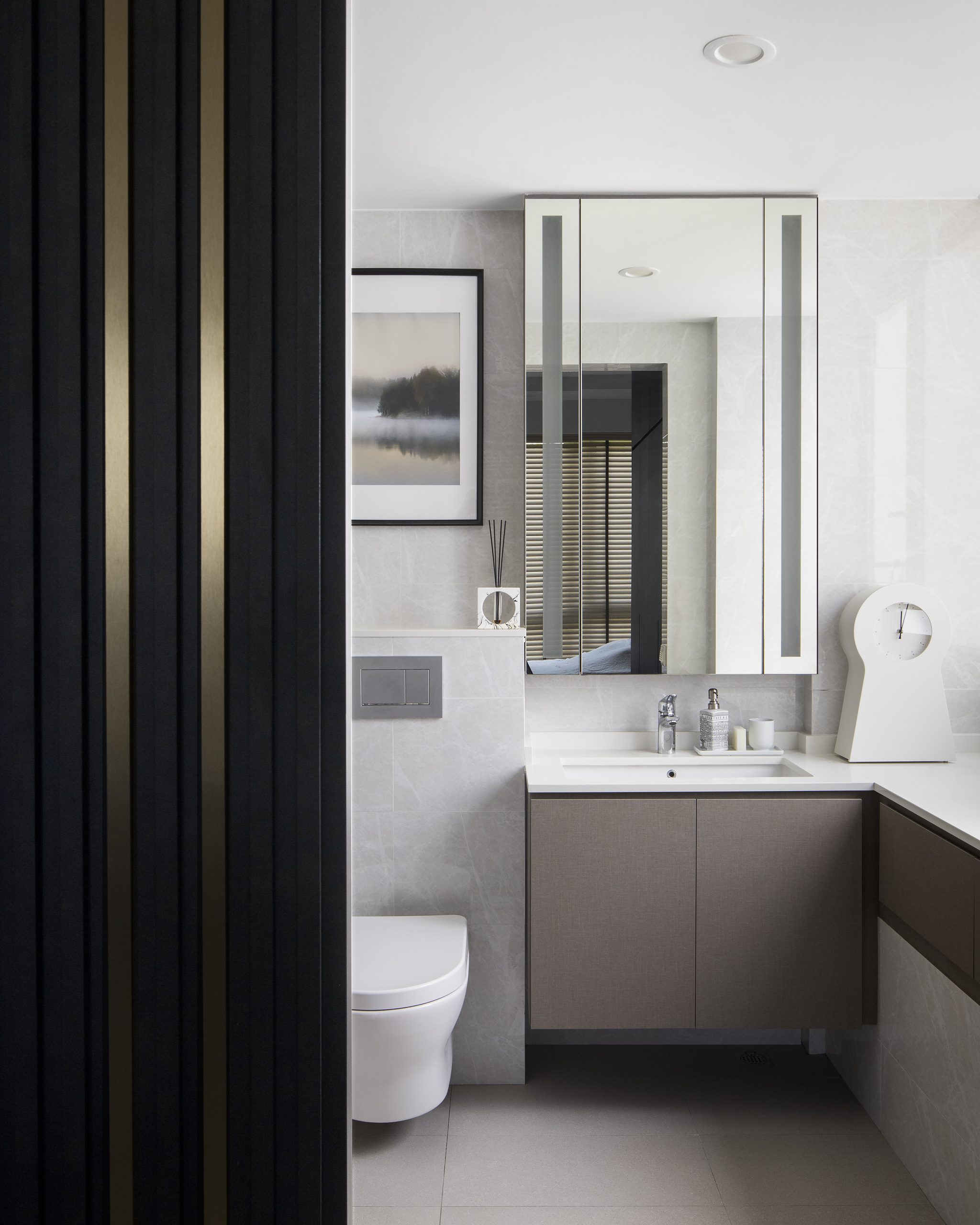 Private spaces such as the study and bathrooms continue the same restrained elegance. The workspace is designed with focus and comfort in mind, while the bathrooms lean on timeless stone finishes and clean outlines to evoke a spa-like calm. Throughout the home, thoughtful detailing and effortless styling bring balance to everyday living—making this interior both stylish and deeply comfortable.