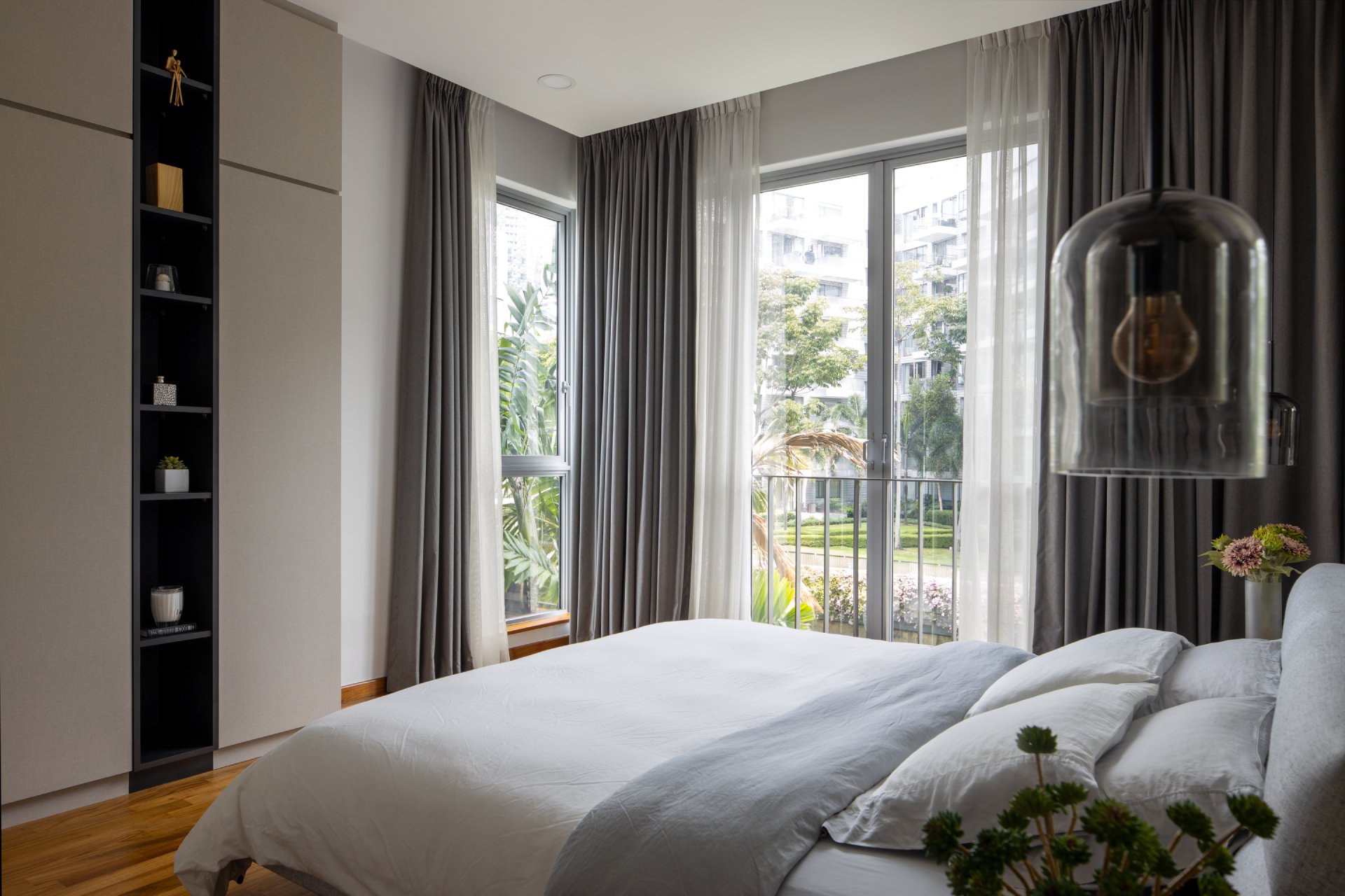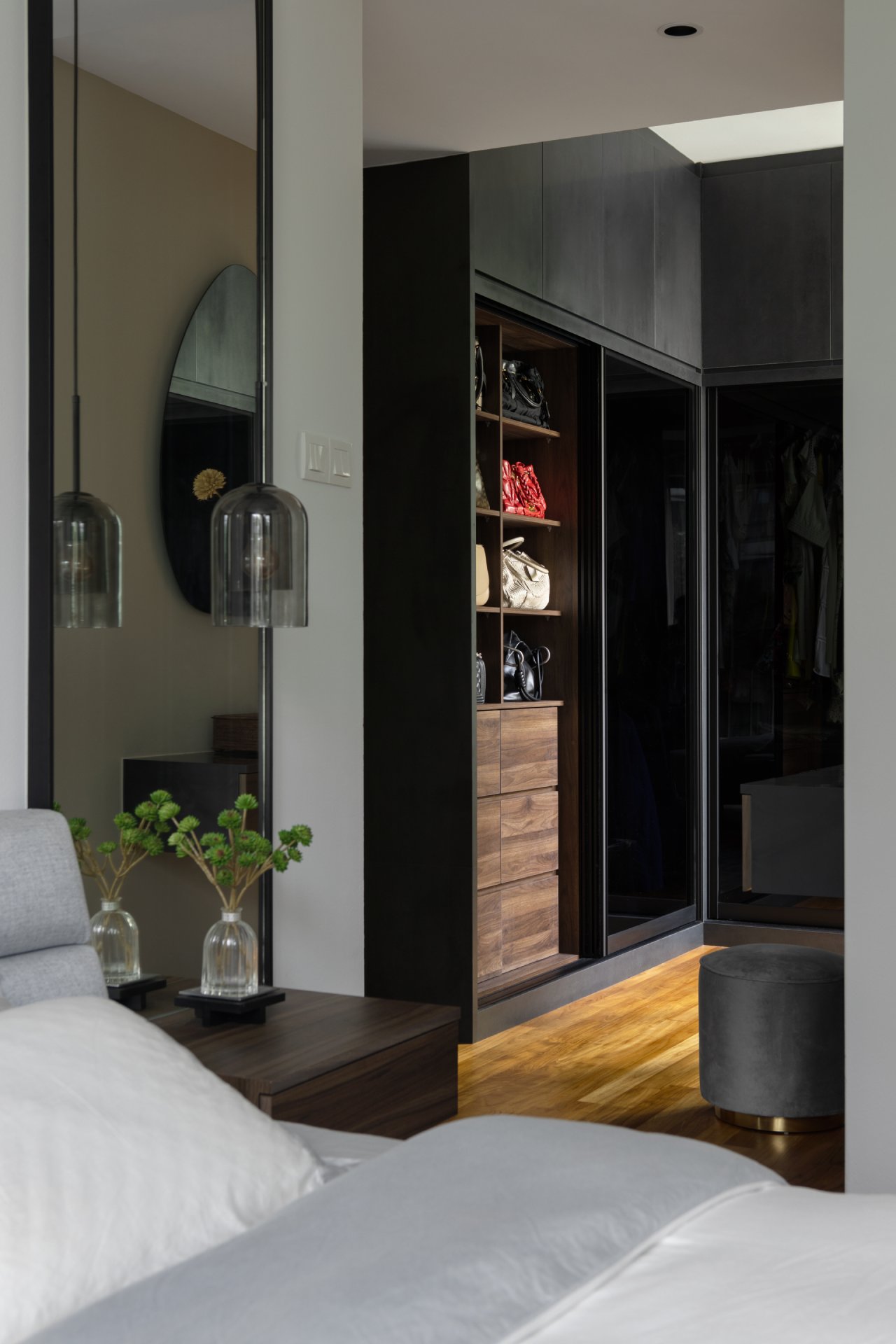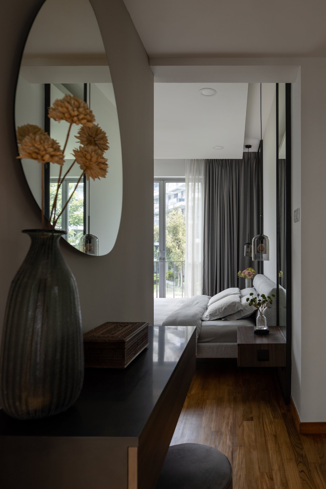 In the private areas, comfort and subtle indulgence take centre stage. The master suite features soft greys, hotel-inspired bedding and intimate lighting, complemented by a walk-in wardrobe finished in matte blacks and walnut tones. Secondary rooms, including a cosy platform bedroom and a study overlooking lush greenery, are designed with equal attention to proportion, mood and everyday usability. Every corner of this condo reflects a considered balance of luxury, warmth and timeless modernity—an elevated sanctuary made for relaxed, elegant living.