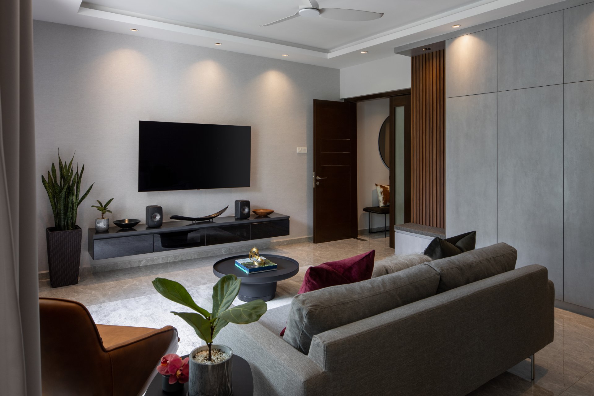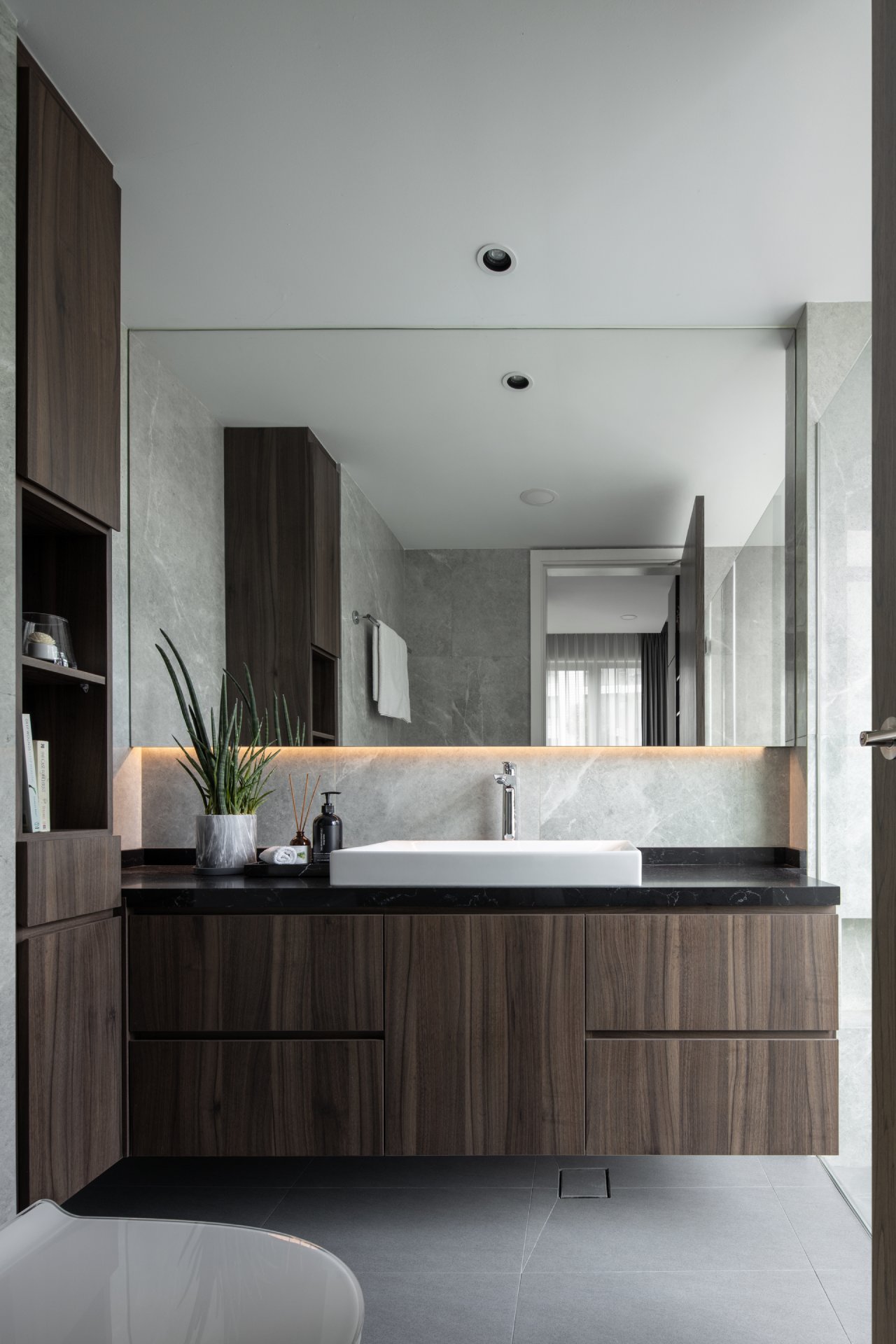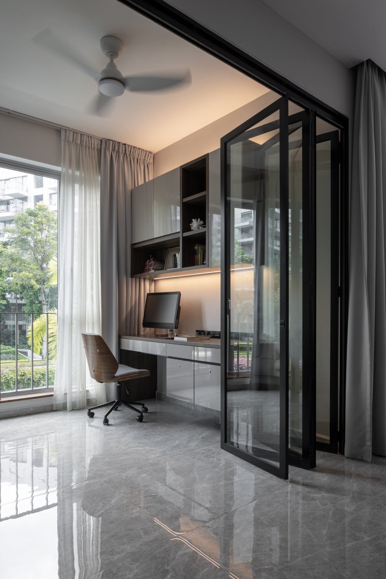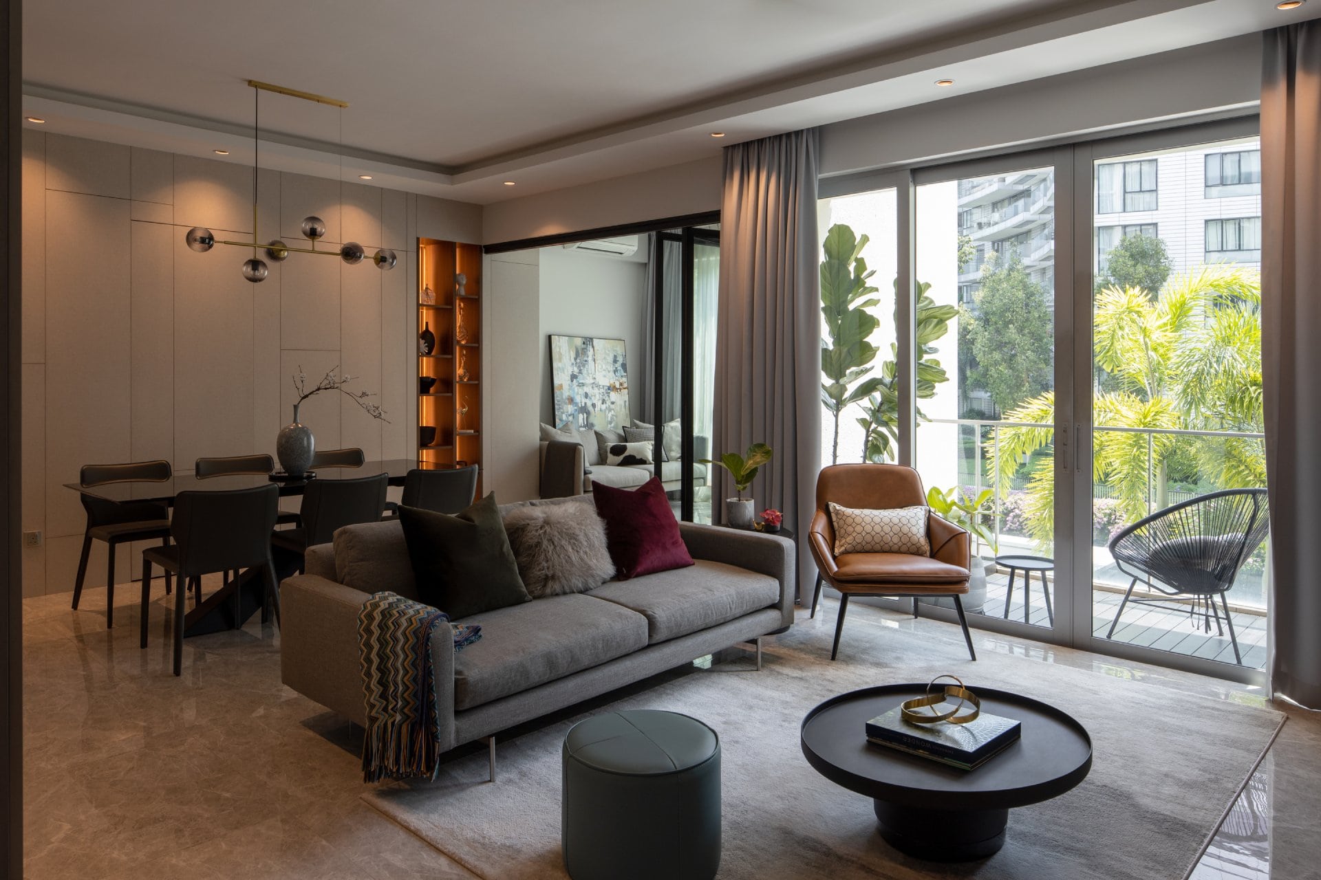 In the private areas, comfort and subtle indulgence take centre stage. The master suite features soft greys, hotel-inspired bedding and intimate lighting, complemented by a walk-in wardrobe finished in matte blacks and walnut tones. Secondary rooms, including a cosy platform bedroom and a study overlooking lush greenery, are designed with equal attention to proportion, mood and everyday usability. Every corner of this condo reflects a considered balance of luxury, warmth and timeless modernity—an elevated sanctuary made for relaxed, elegant living.