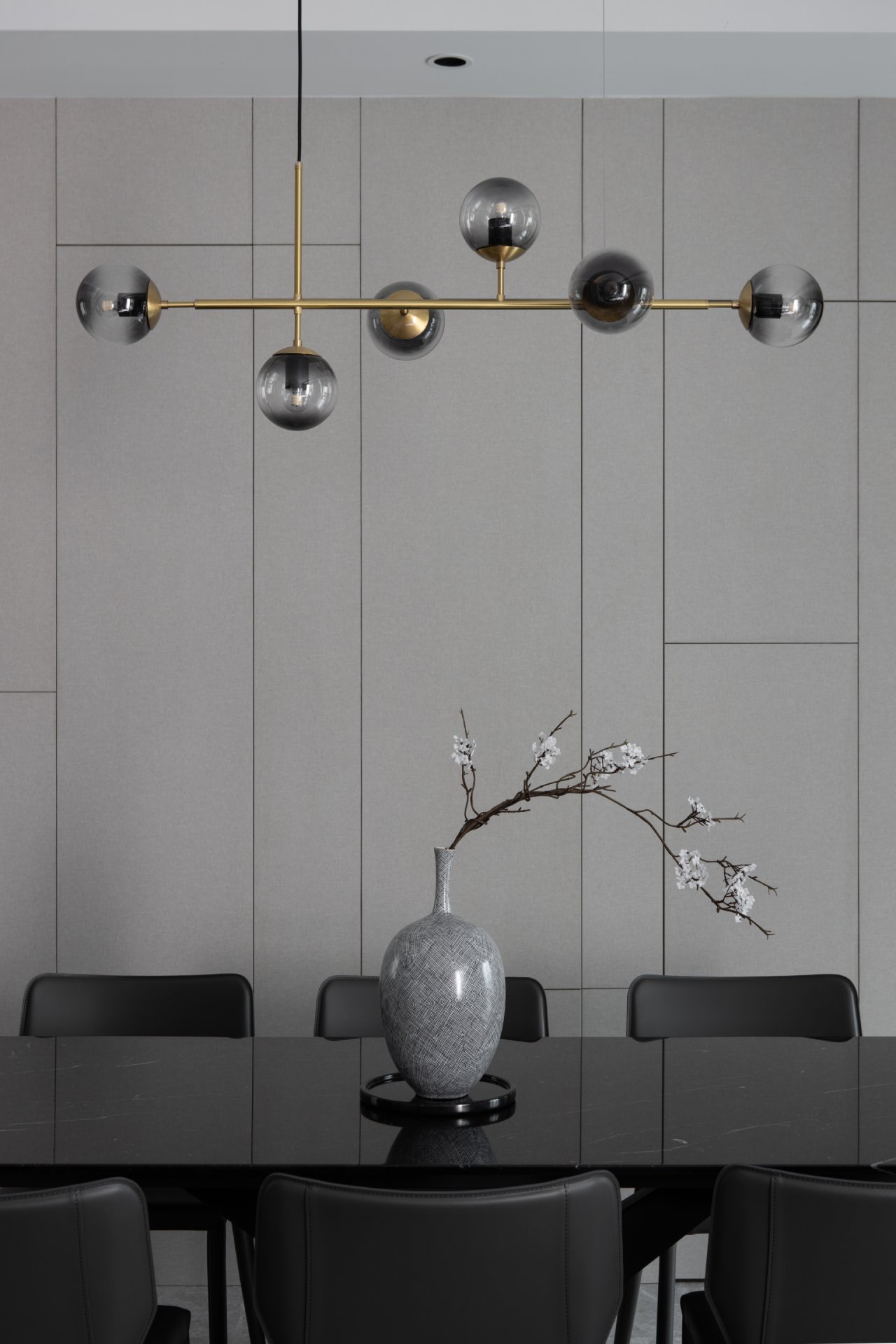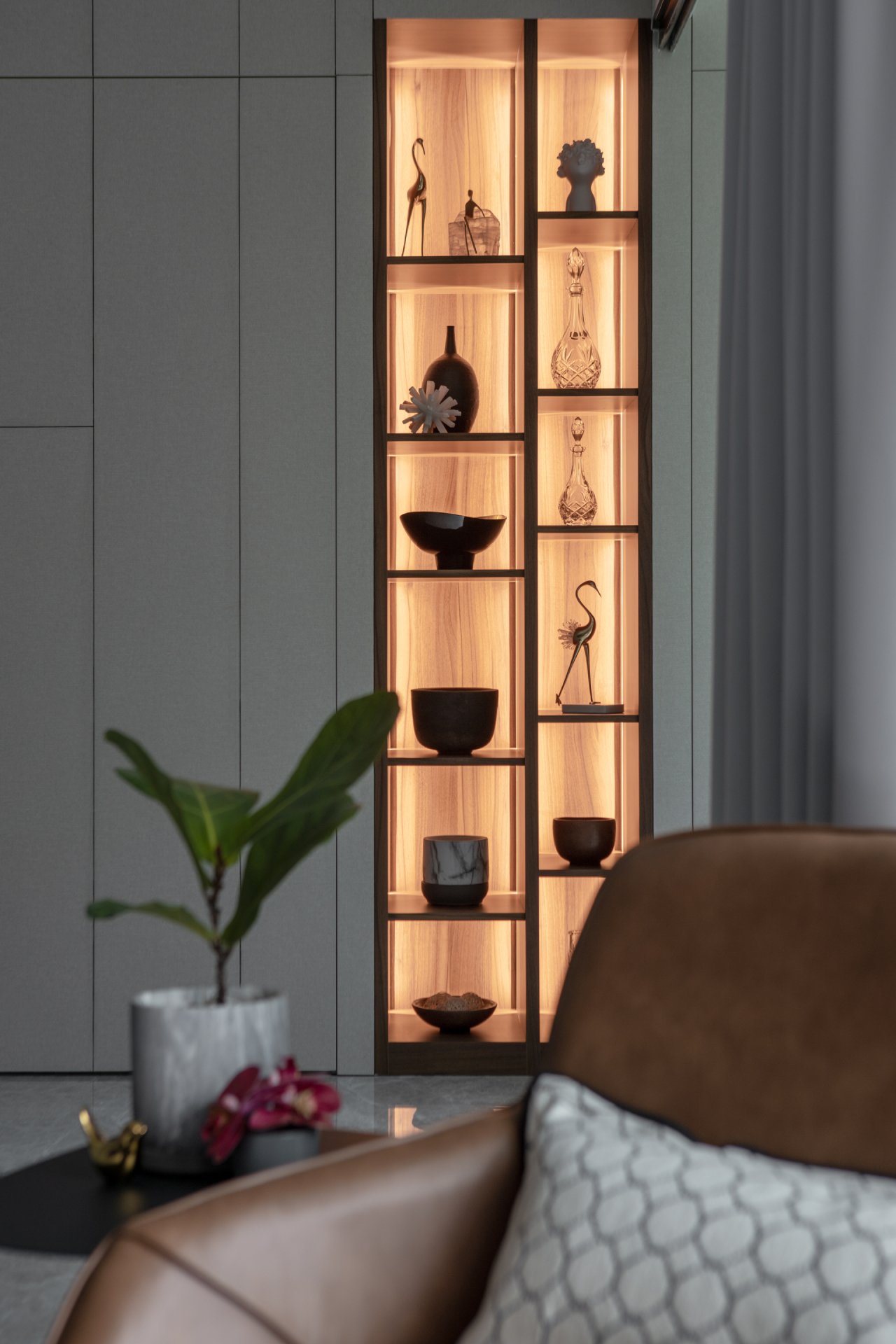 The living and dining zones are anchored by clean architectural lines and a muted palette, allowing statement pieces—such as the illuminated display niche, sculptural lighting, and rich upholstery—to lend depth and elegance. The kitchen continues this narrative with dark marble, warm timber grains and sleek matte cabinetry, offering both function and refinement.