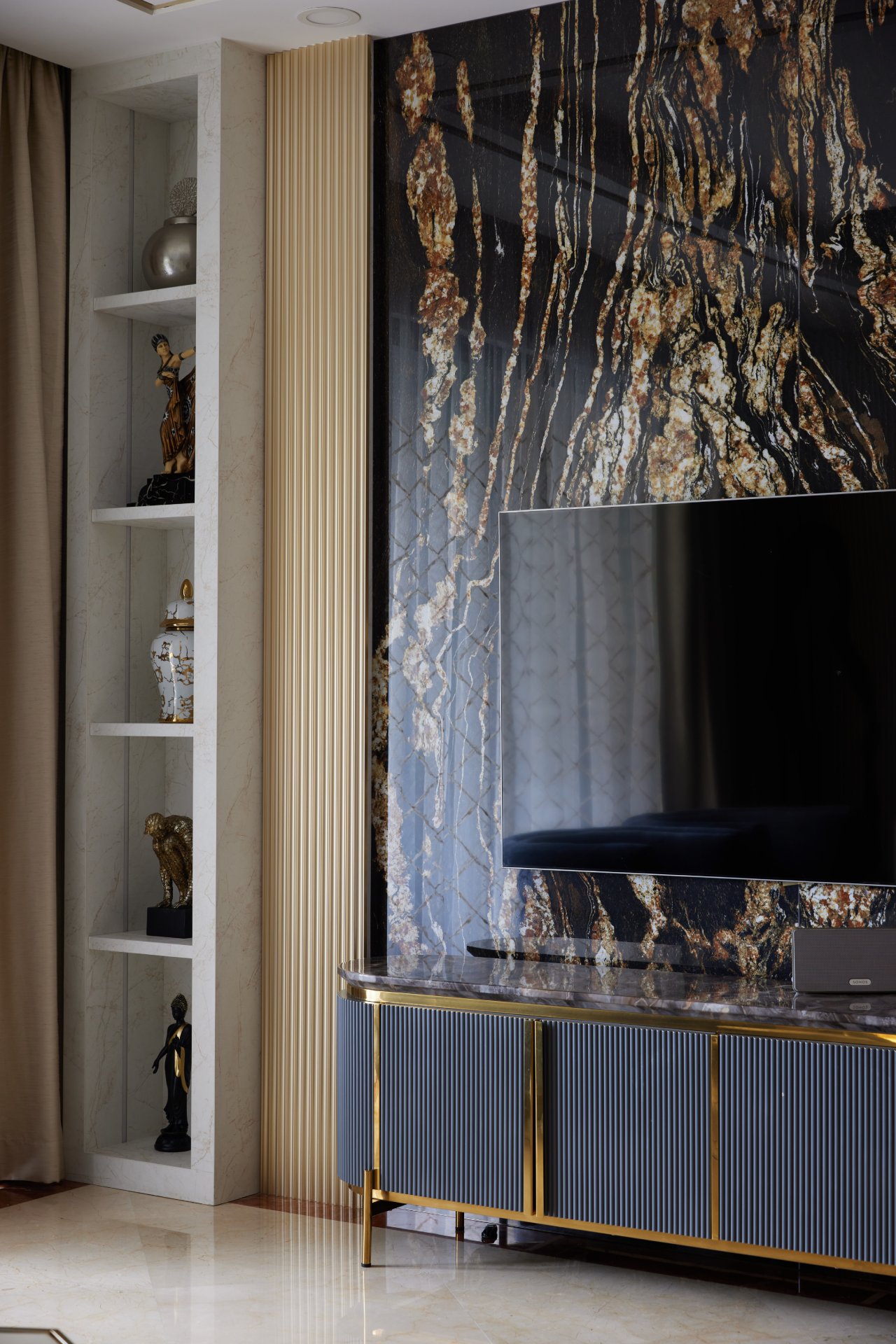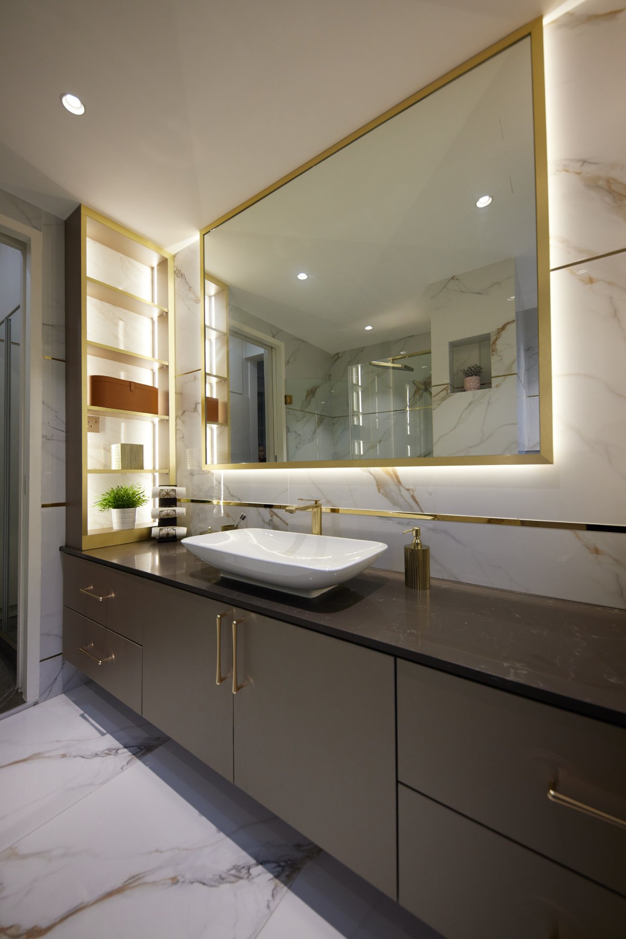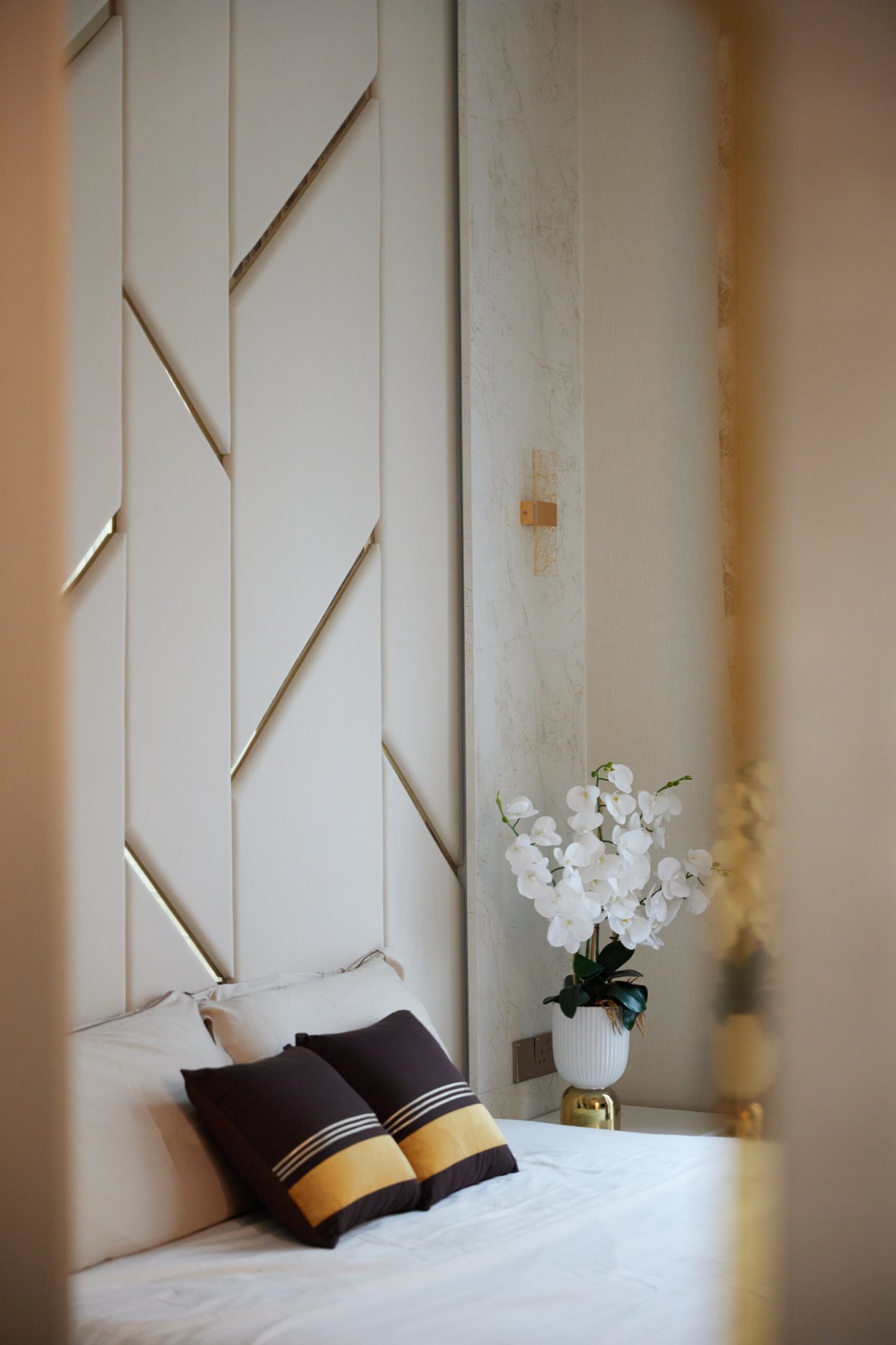 The kitchen and bedrooms carry this luxurious narrative into softer, more refined palettes. A long, streamlined kitchen in warm nude tones is elevated through a bold Calacatta-inspired backsplash, while the master bedroom layers creamy panels, brushed gold trims and soft florals to evoke a hotel-suite serenity. The bathrooms continue the theme, each with its own identity: one light and polished with white marble veining and gold hardware; the other dramatic with midnight stone and a striking bronze basin.