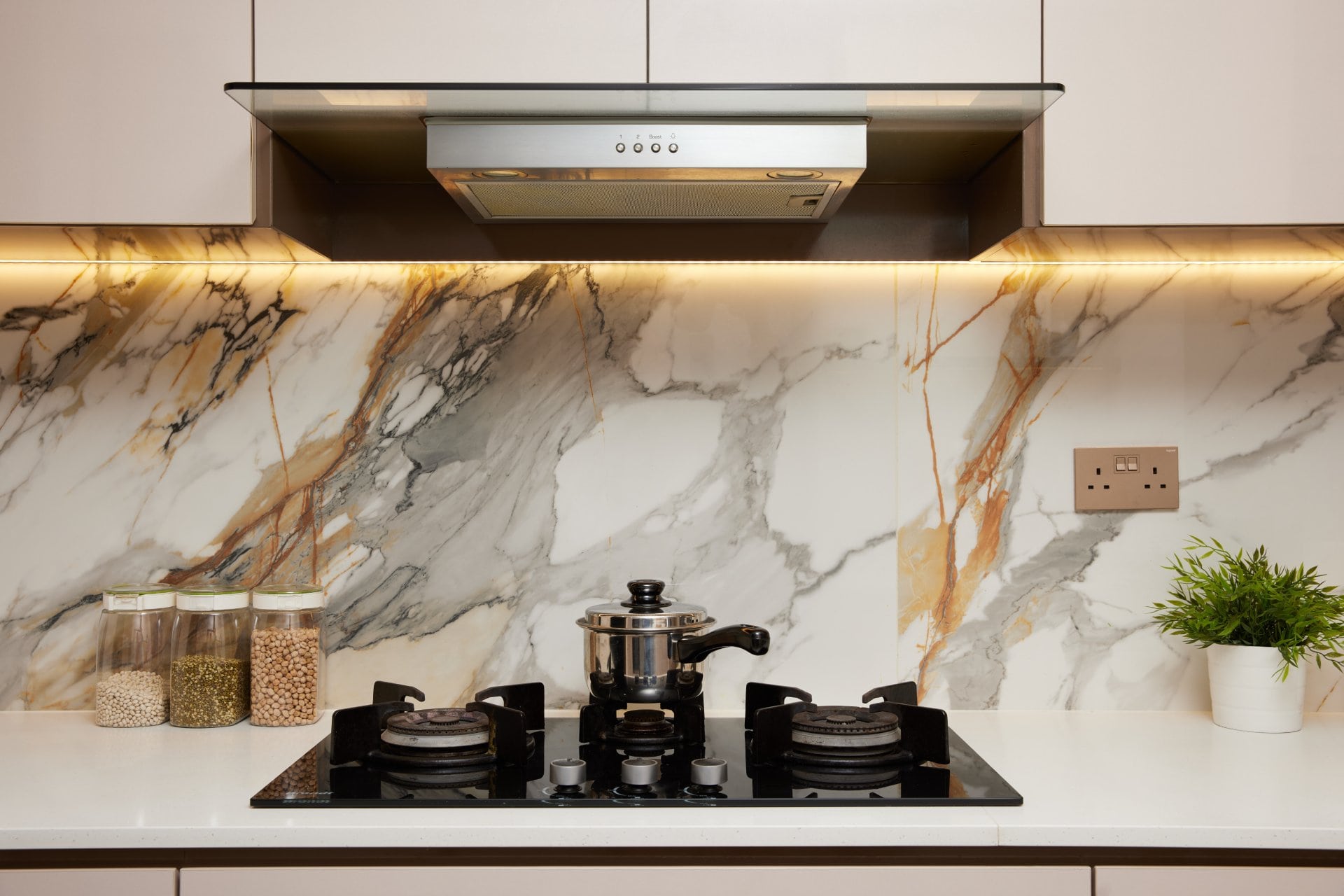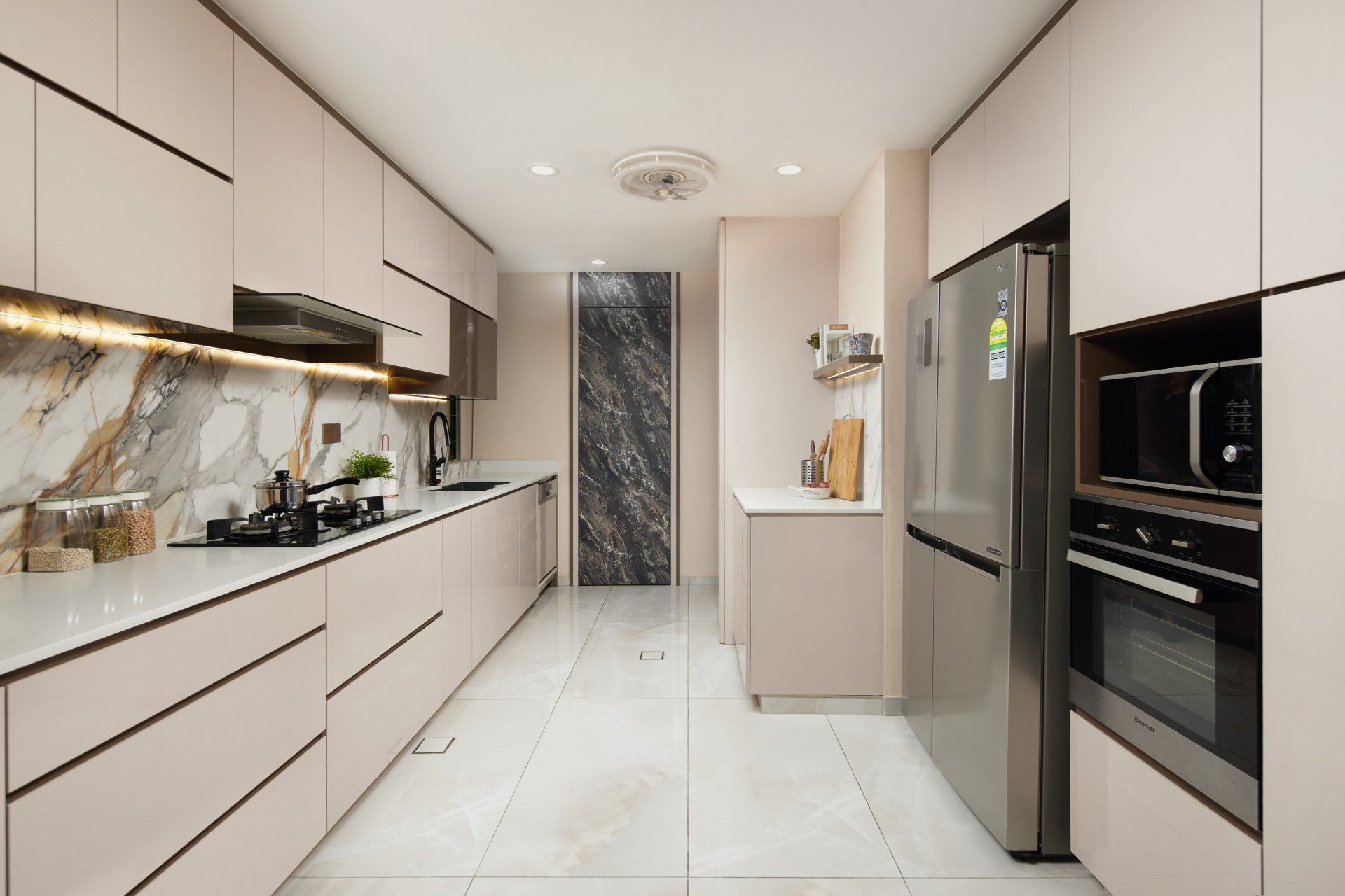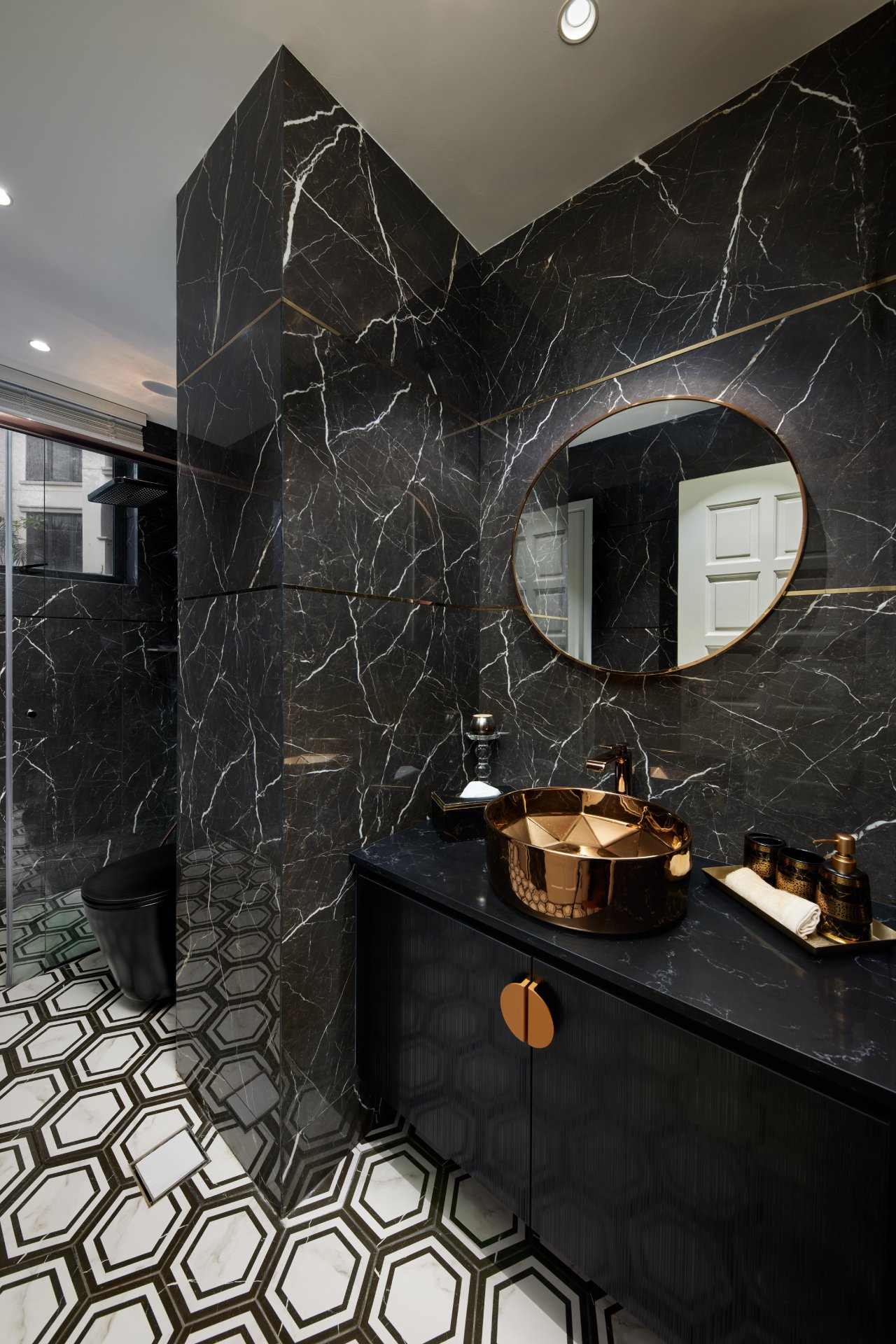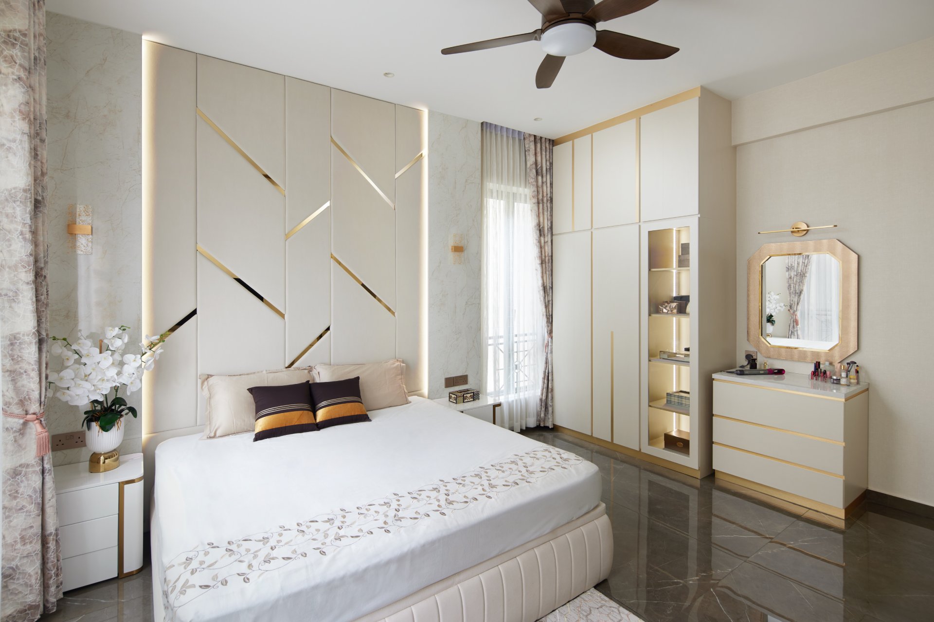 The kitchen and bedrooms carry this luxurious narrative into softer, more refined palettes. A long, streamlined kitchen in warm nude tones is elevated through a bold Calacatta-inspired backsplash, while the master bedroom layers creamy panels, brushed gold trims and soft florals to evoke a hotel-suite serenity. The bathrooms continue the theme, each with its own identity: one light and polished with white marble veining and gold hardware; the other dramatic with midnight stone and a striking bronze basin.