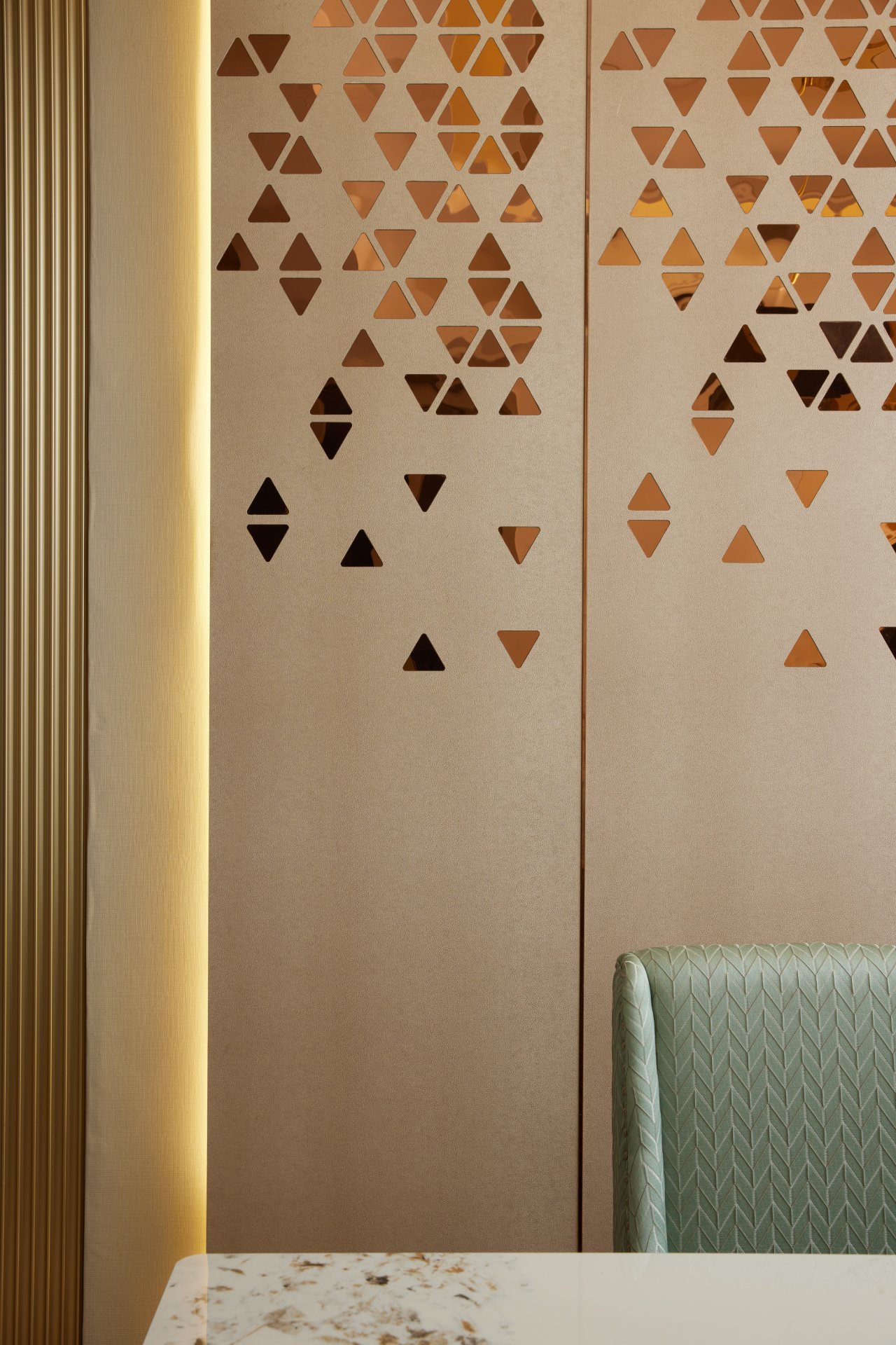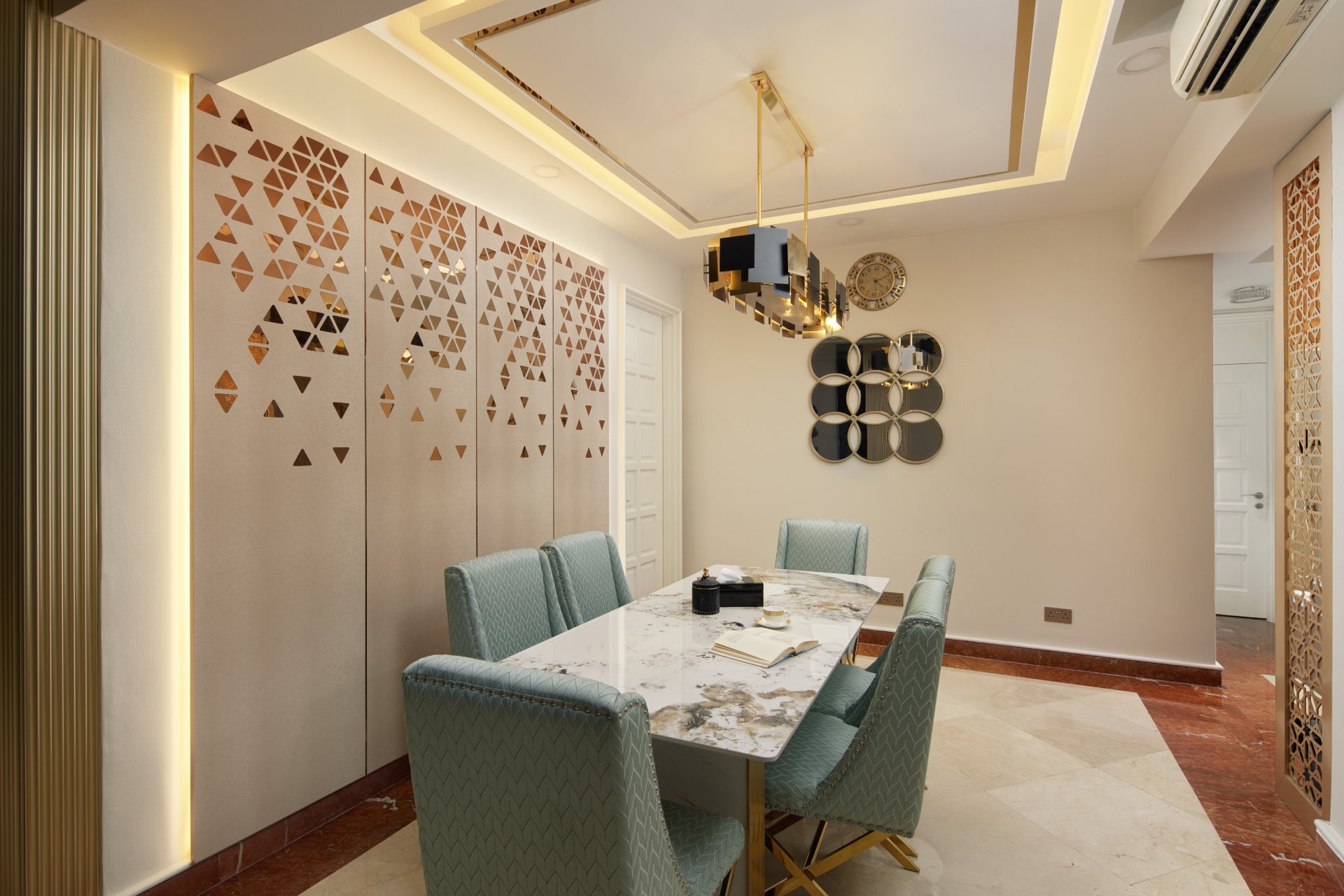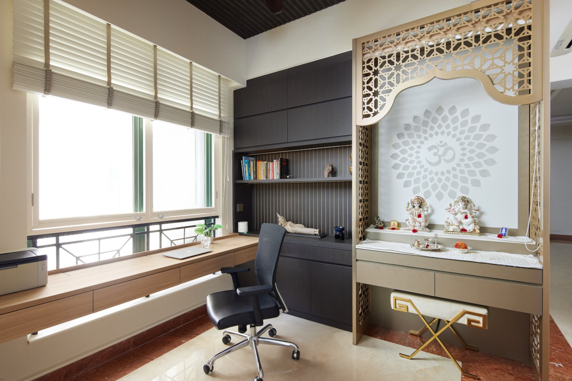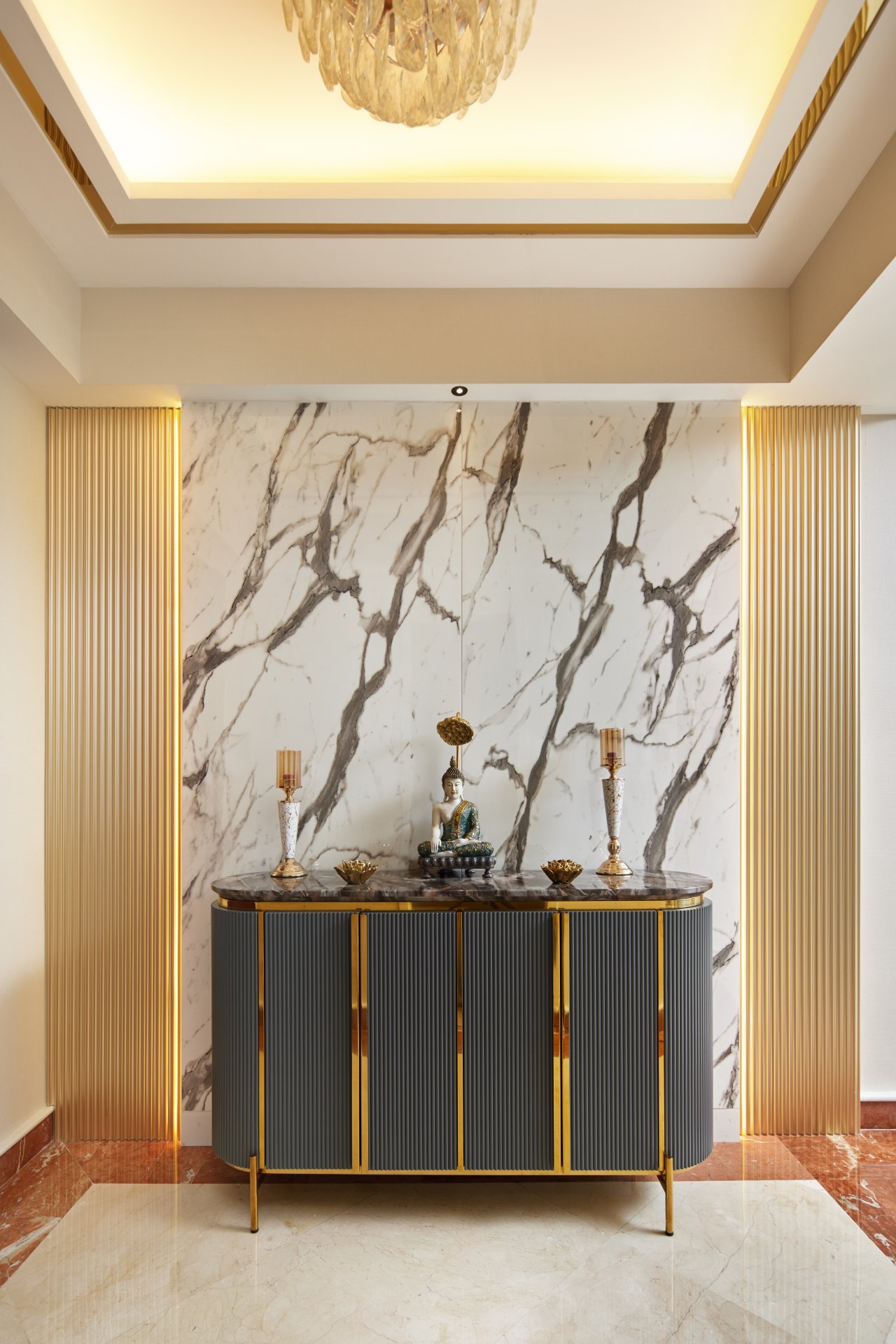 Throughout the home, gold accents and expressive textures form the visual language. The dining room pairs geometric mirrorwork and custom metal inlays with an elegant marble table, creating a setting that balances sophistication with statement-making personality. In the study, dark cabinetry and brass-lined shelving frame a serene pooja area, blending functionality with spiritual calm in a seamless, contemporary composition.