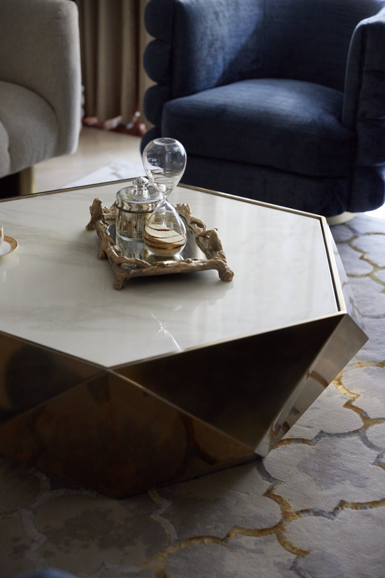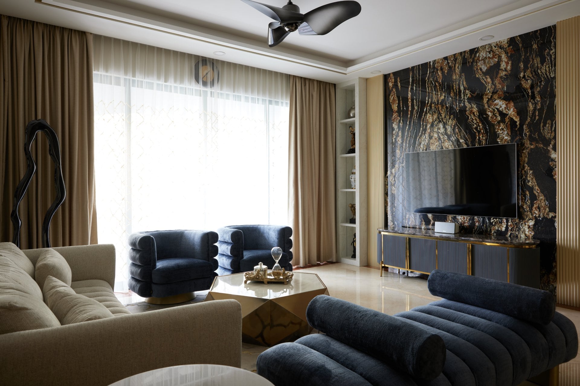 This Pebble Bay residence embraces a dramatic, modern-glam aesthetic where sculptural forms, rich materials, and expressive detailing come together to create a home that feels both indulgent and artfully curated. From the very first glance, the living room sets the tone: deep sapphire-blue velvet seating anchors the space, while a faceted gold coffee table and a striking natural stone feature wall amplify the sense of grandeur. Soft champagne drapery and layered lighting temper the richness, bathing the room in a warm, luminous glow.