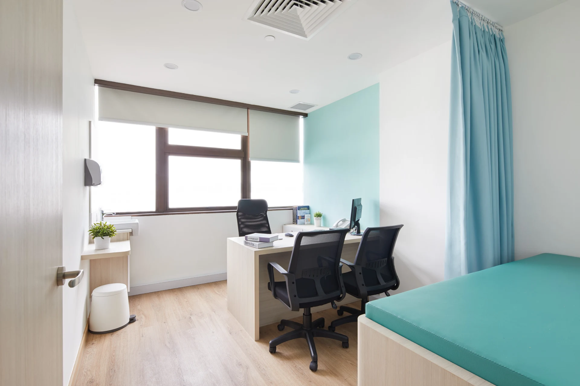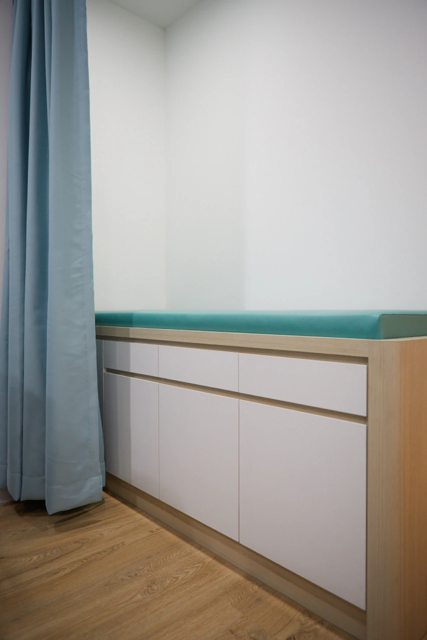 Two consultation rooms were custom-fitted with bespoke cabinetry and integrated consultation beds to ensure ergonomic comfort and seamless functionality for medical procedures. Curtains and strategic planning around room orientation help preserve privacy while allowing natural light to enter where possible.