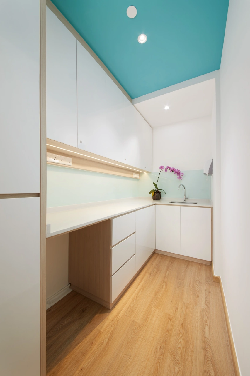 A compact but thoughtfully planned pantry was included for staff convenience. High-gloss white cabinets and concealed under-cabinet lighting ensure the space remains bright and hygienic.