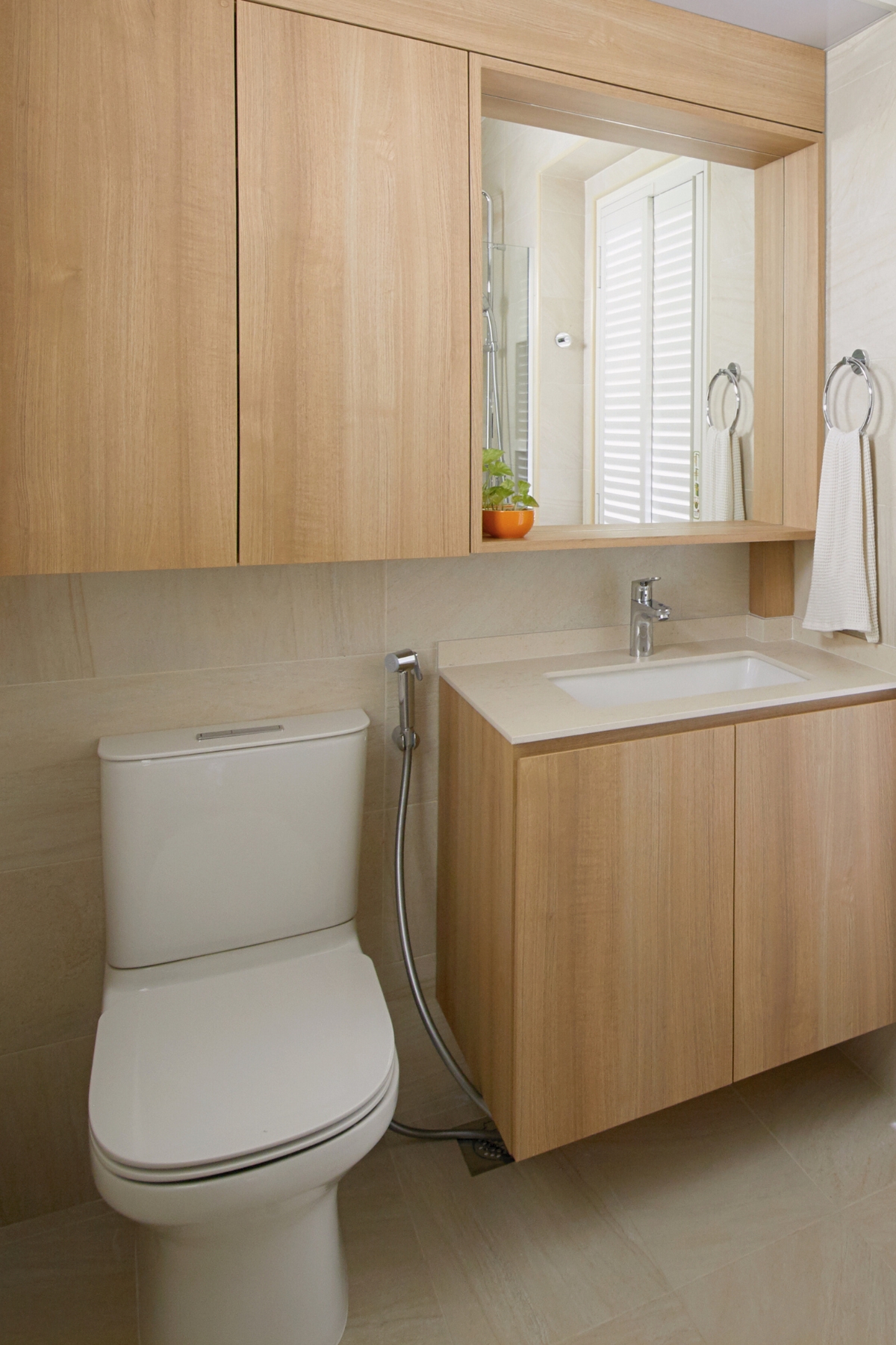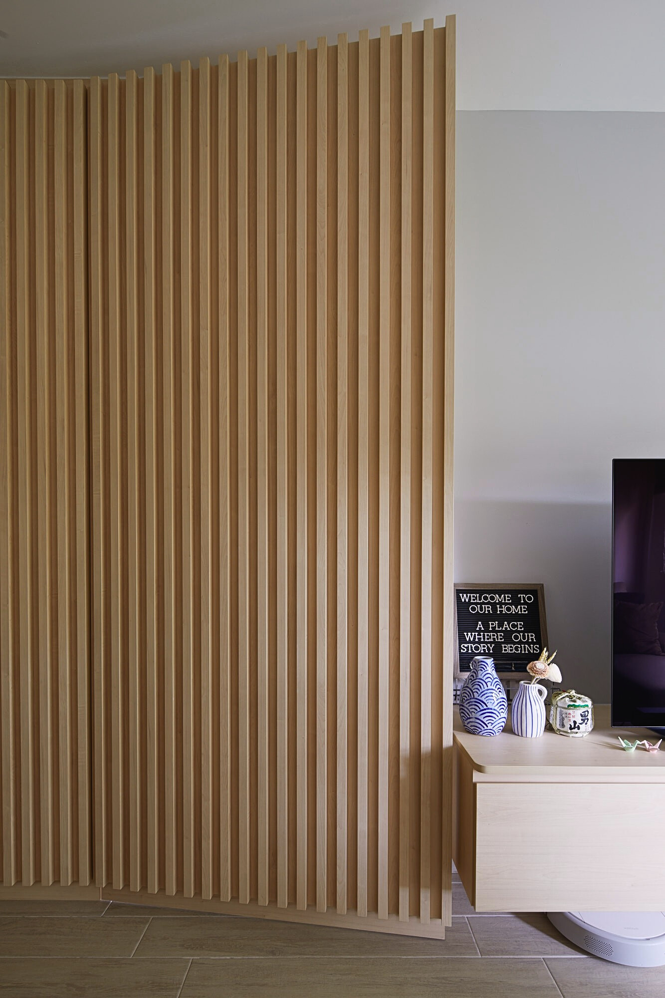 In the living and dining areas, vertical timber details, curved niches and thoughtful built-ins bring a quiet rhythm to the space—balancing functional storage with a soft, minimalist aesthetic. The kitchen and bathrooms continue this warm narrative with light wood cabinetry, subtle tonal contrasts and purposeful organisation that reflect Muji’s emphasis on everyday ease.