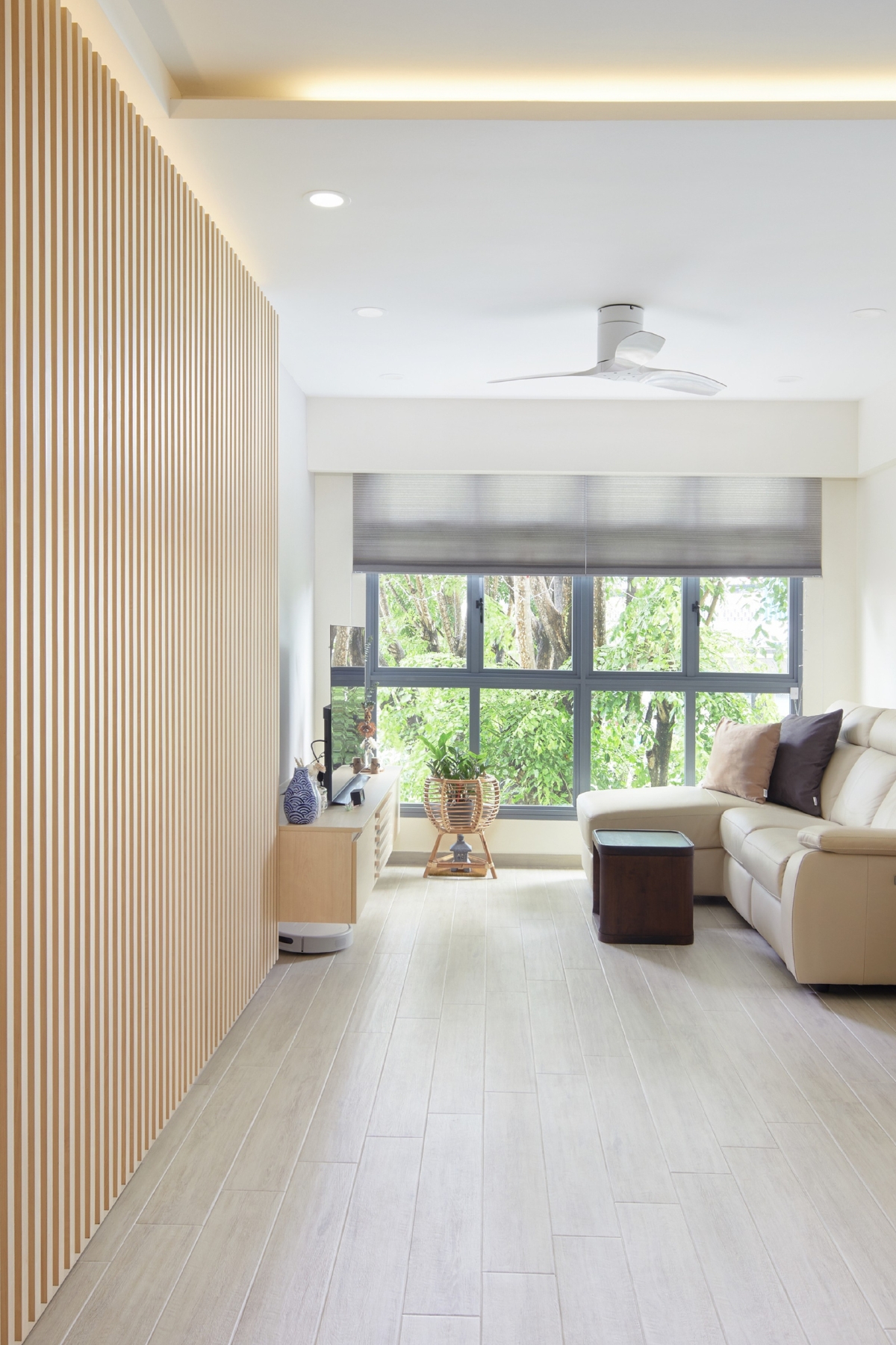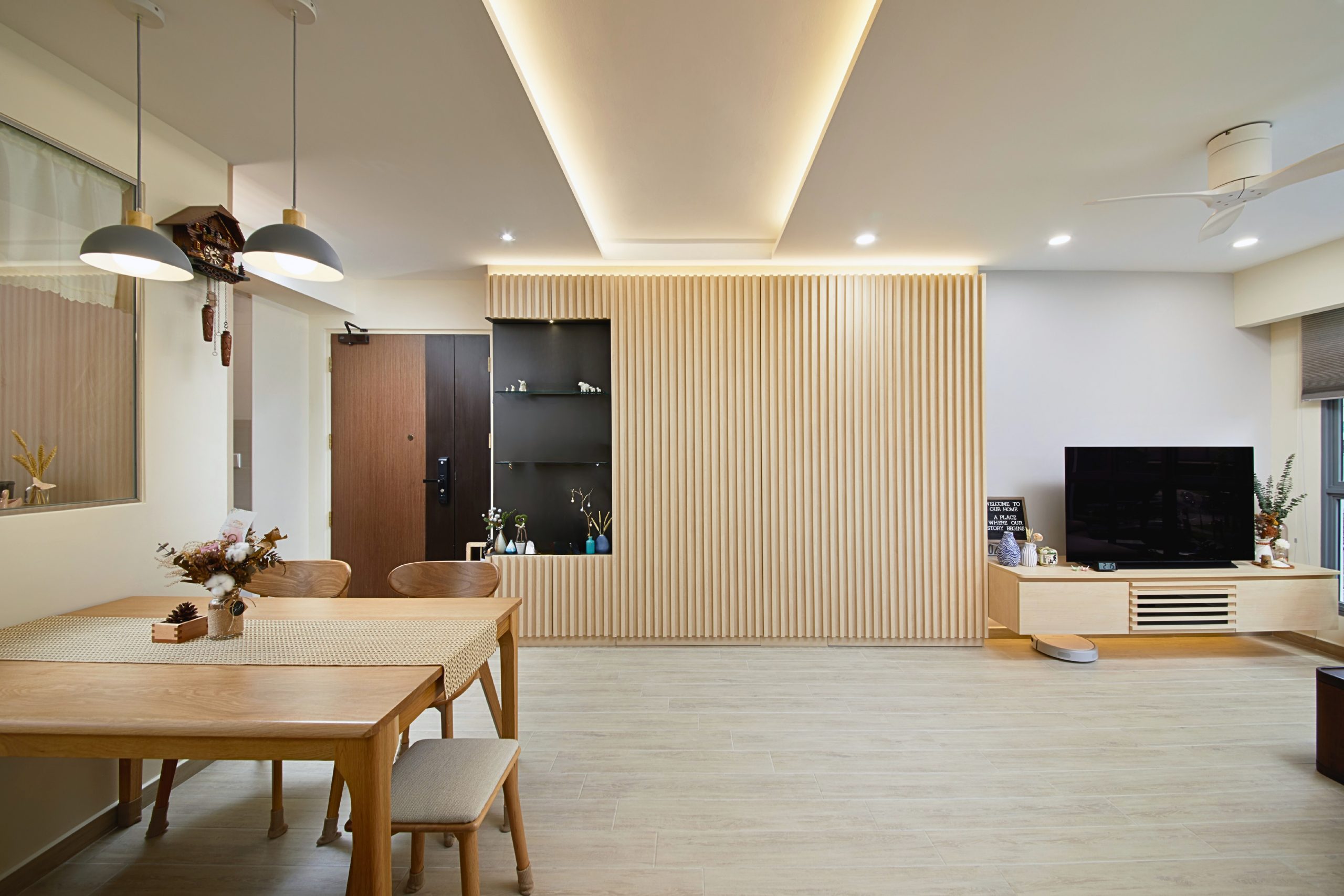 Private rooms use muted colours and warm accents to maintain a restful, harmonious feel, offering cosy corners for rest and work. Every element of this BTO interior design is crafted to feel intentional, natural and effortlessly calm—capturing the essence of Scandinavian comfort and Muji simplicity.
