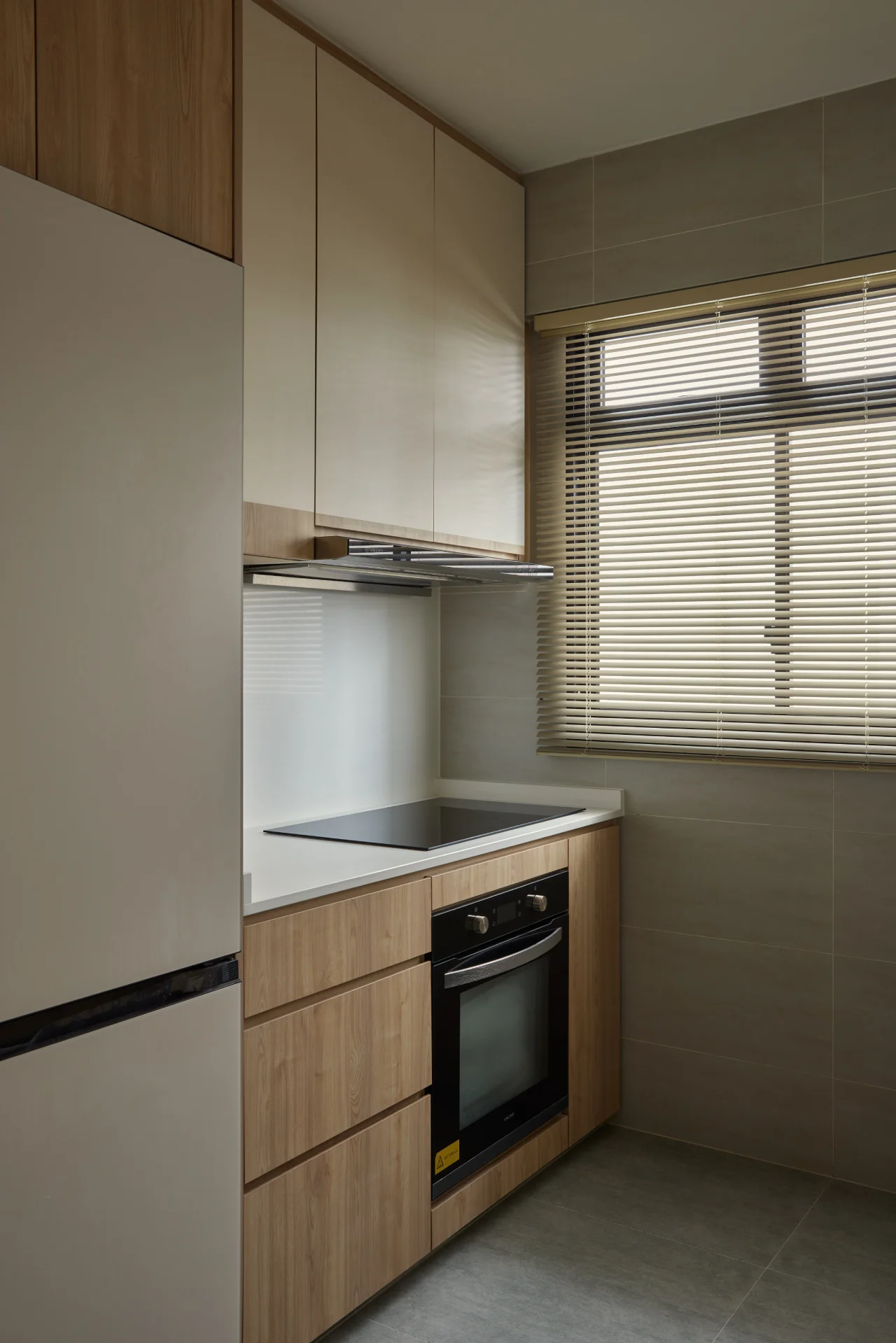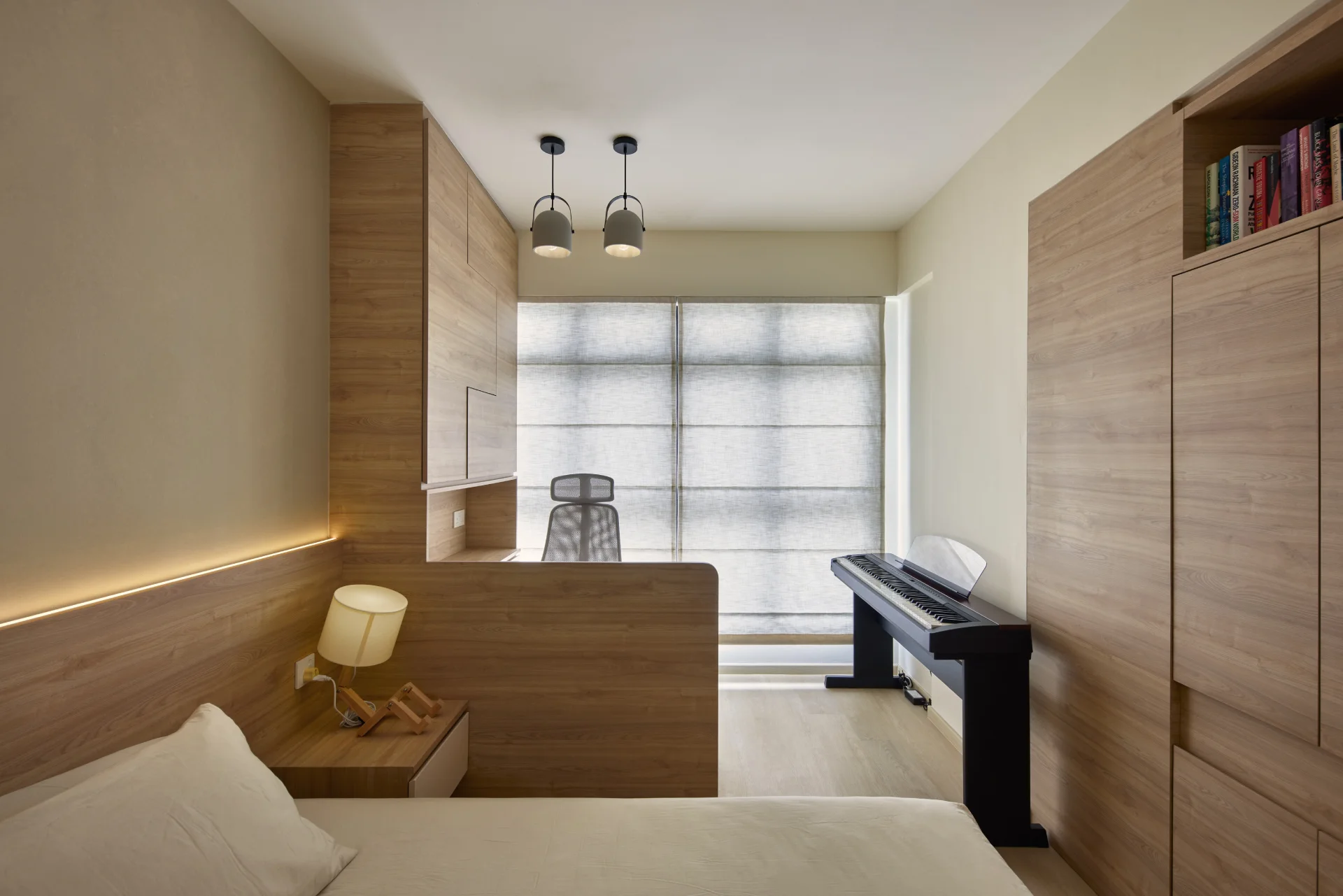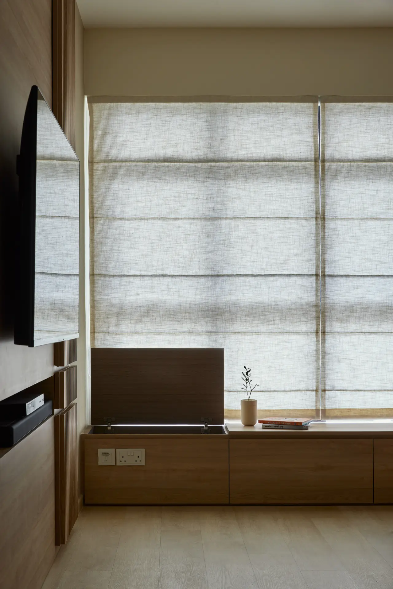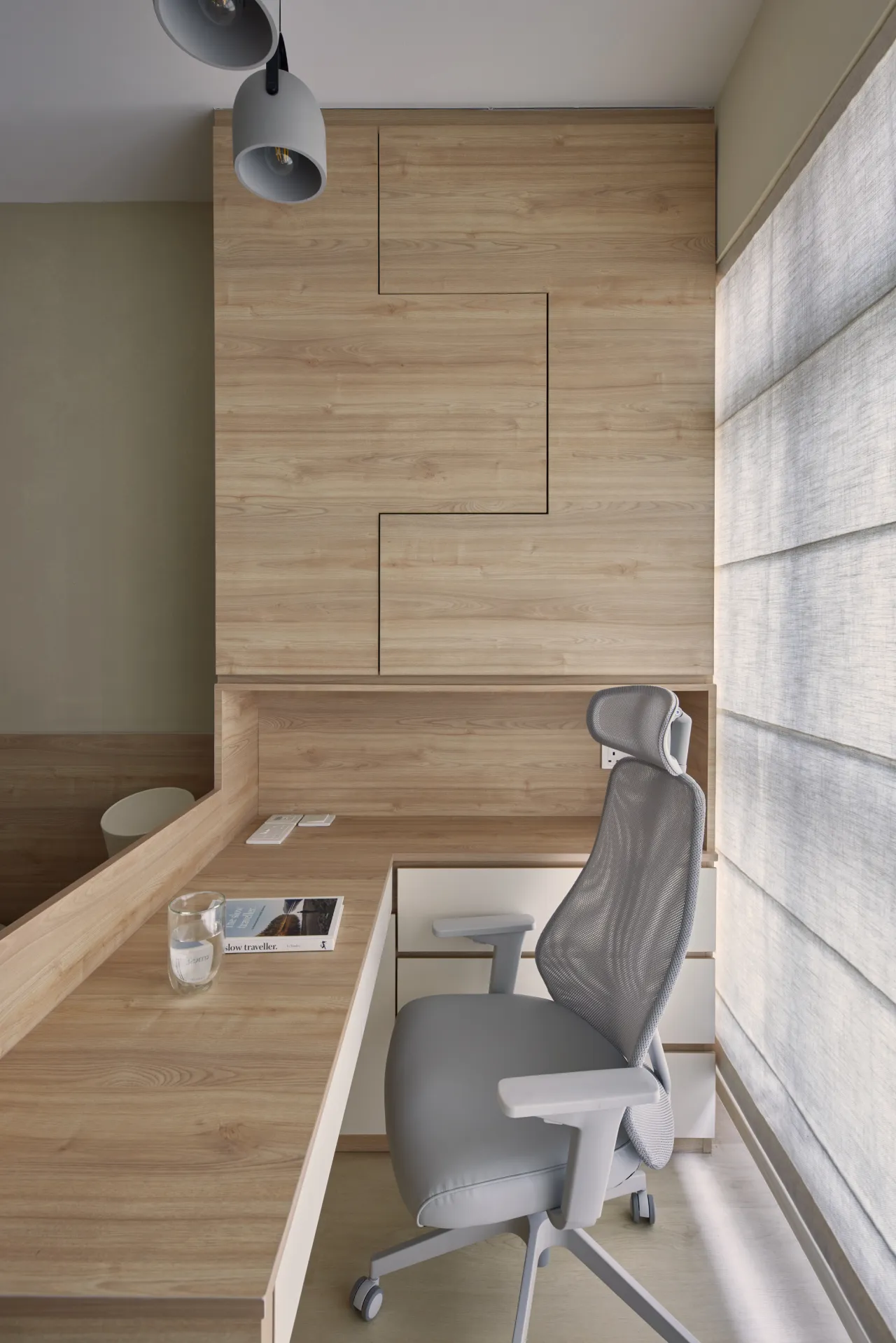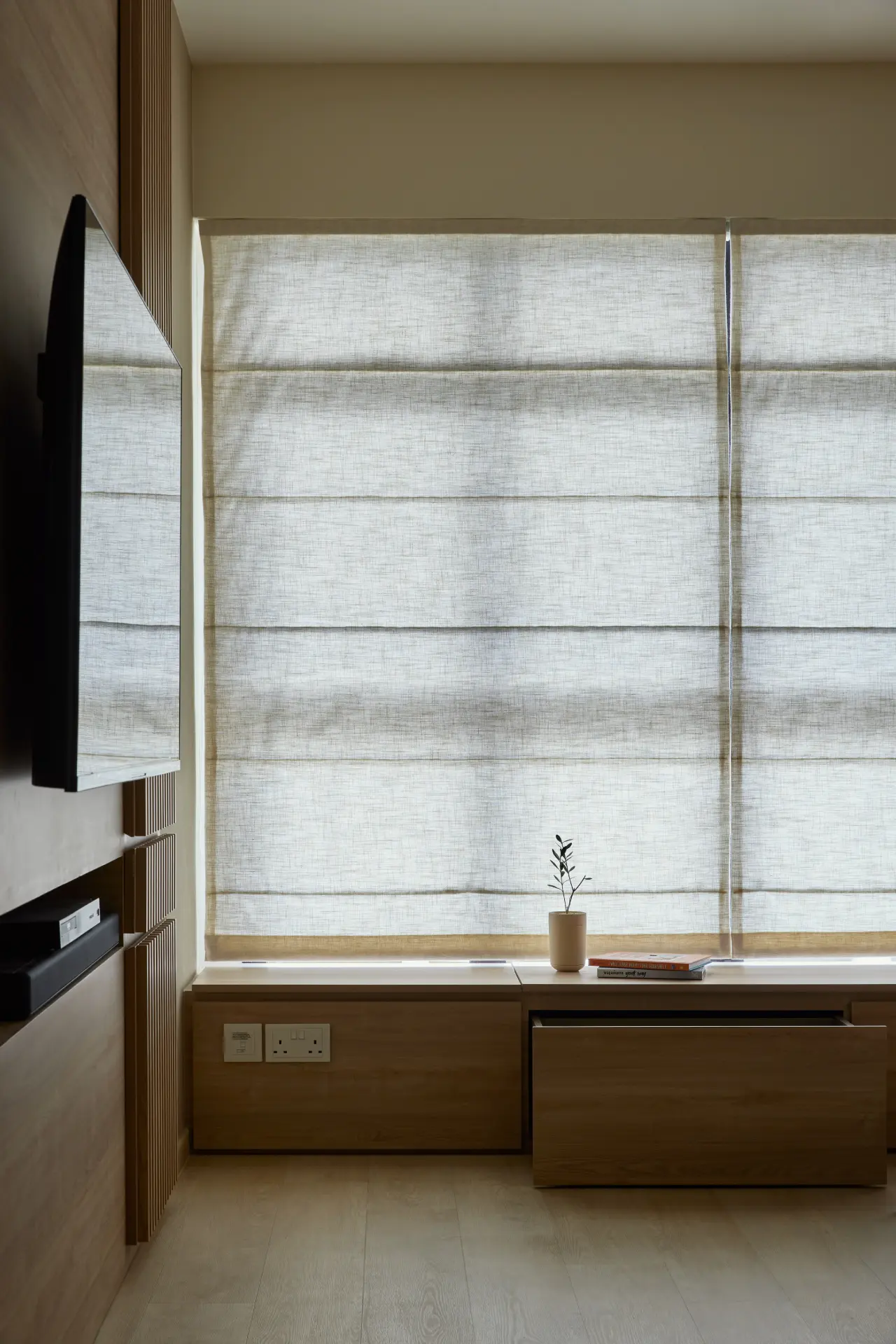 Soft-textured roman blinds diffuse light gently into the home, casting a calm, cocooned atmosphere throughout. In the bedroom, a work-from-home setup is tucked neatly behind a half-height bed partition, with ample cabinetry for supplies and wardrobe needs. Subtle joinery details, like staggered inlay handles and hidden compartments, reinforce the theme of understated function.