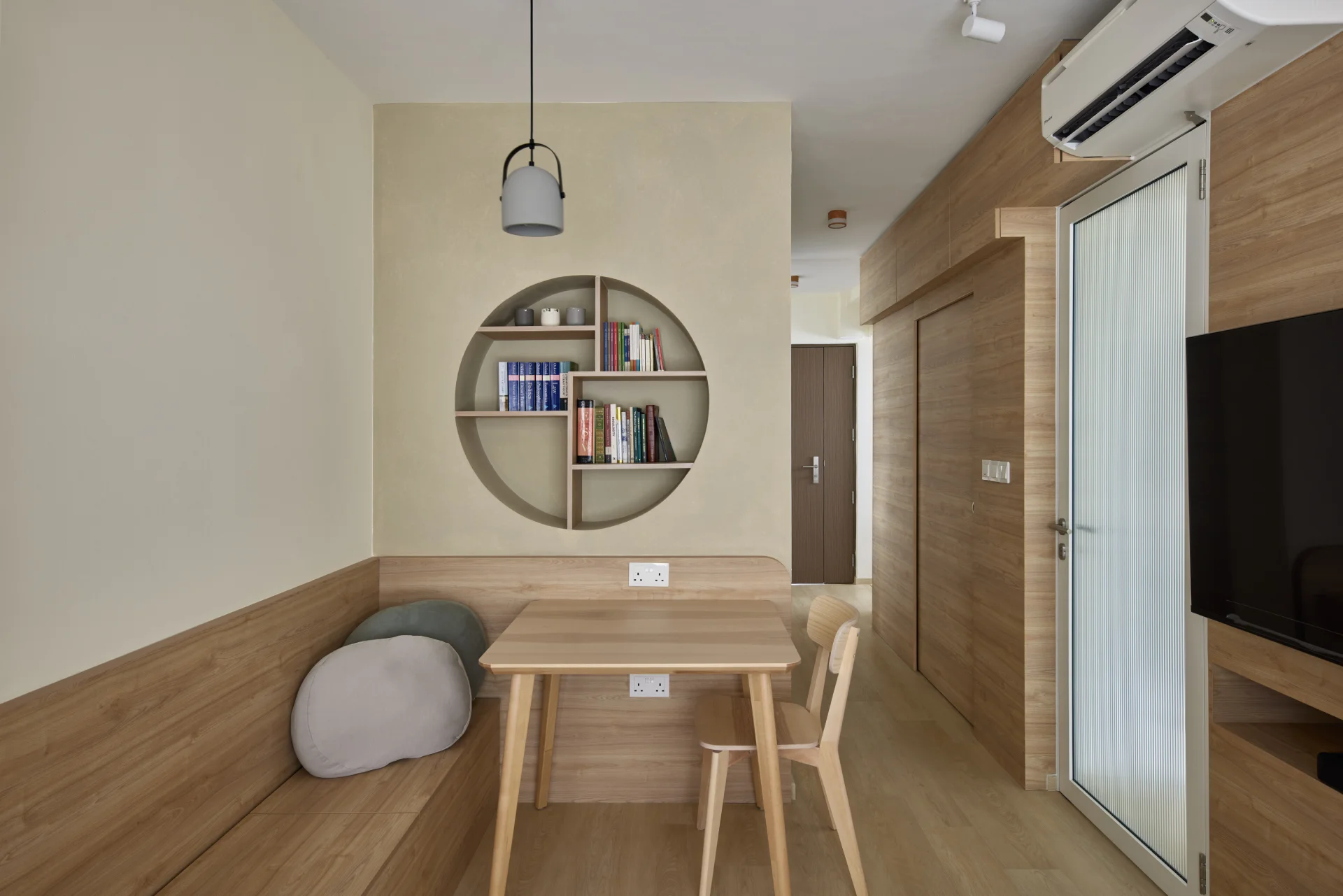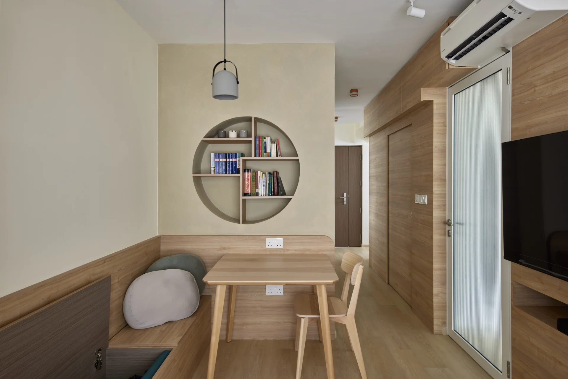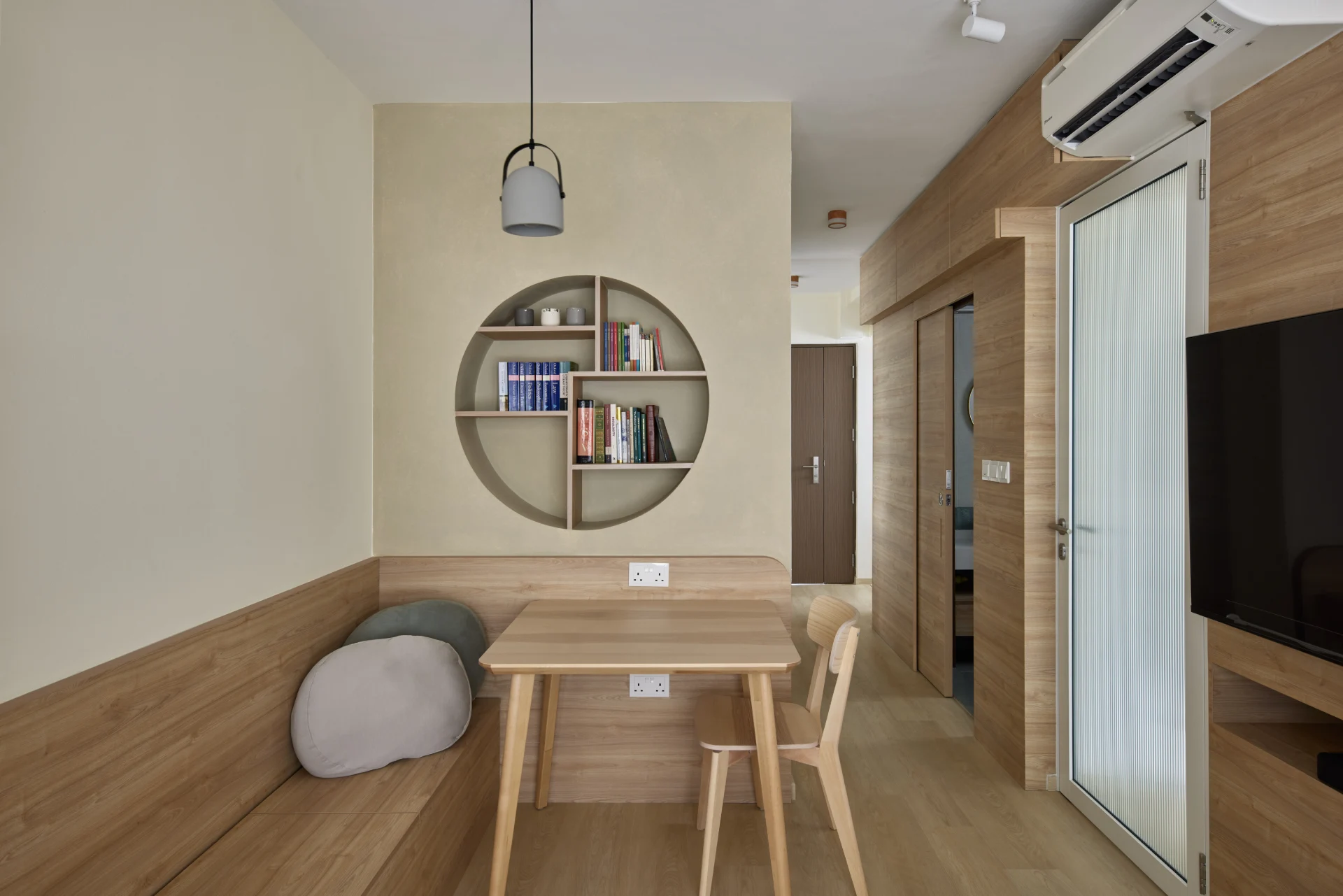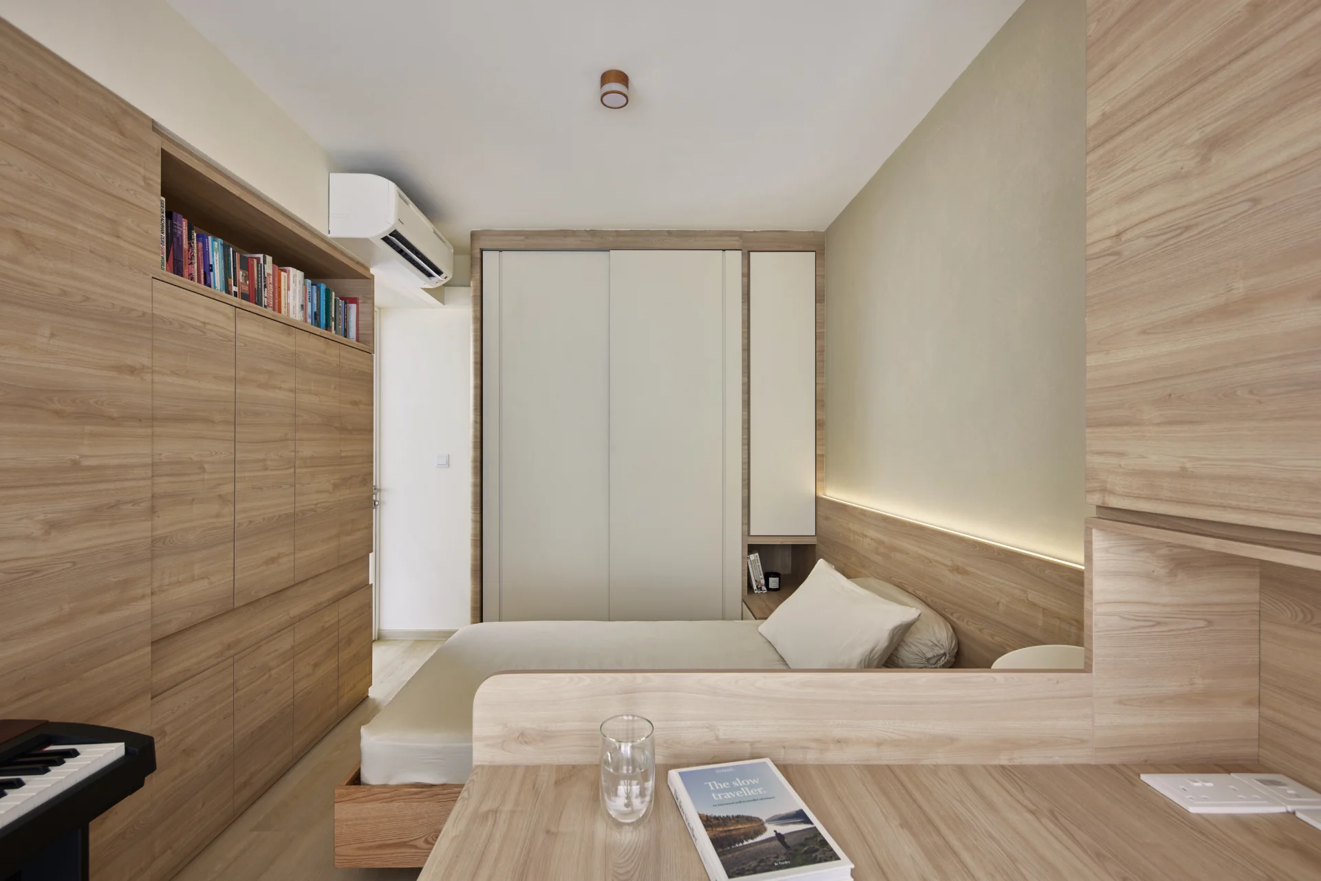 Designed as a peaceful sanctuary for a single occupant, this compact 2-room BTO renovation embraces Scandinavian and Muji sensibilities — soft wood tones, clean-lined built-ins, and smart multi-functional use of space.