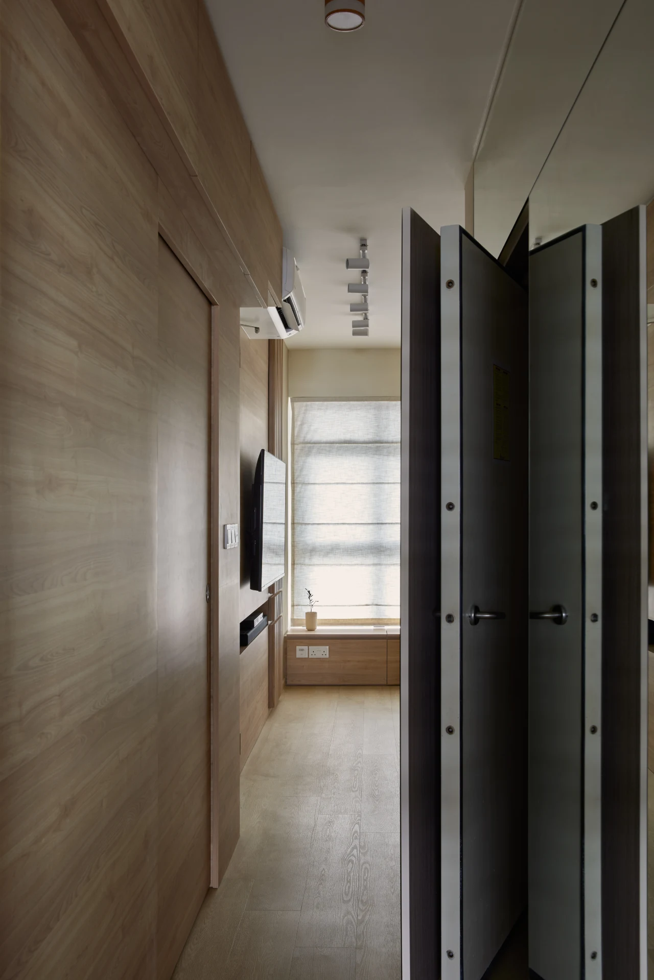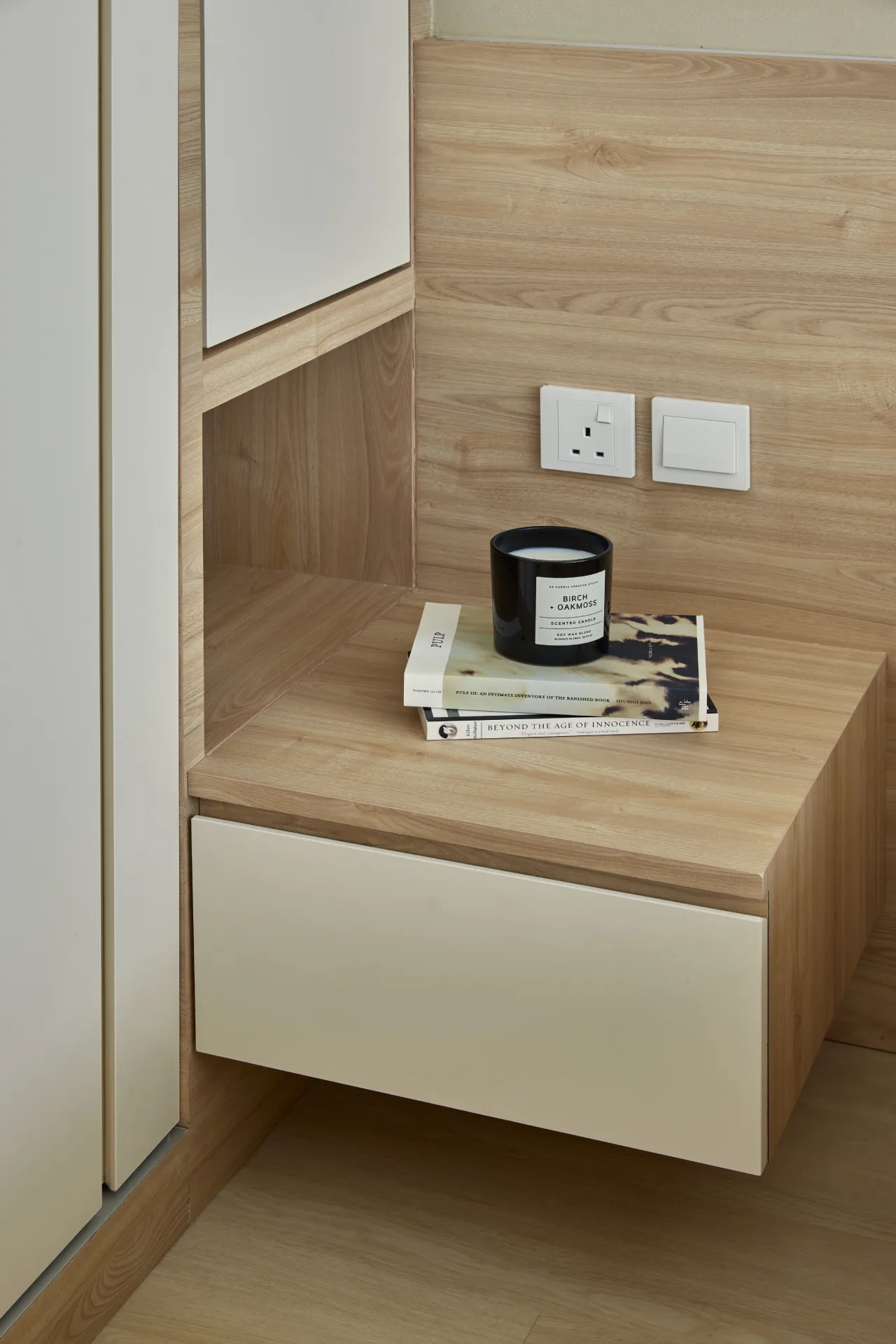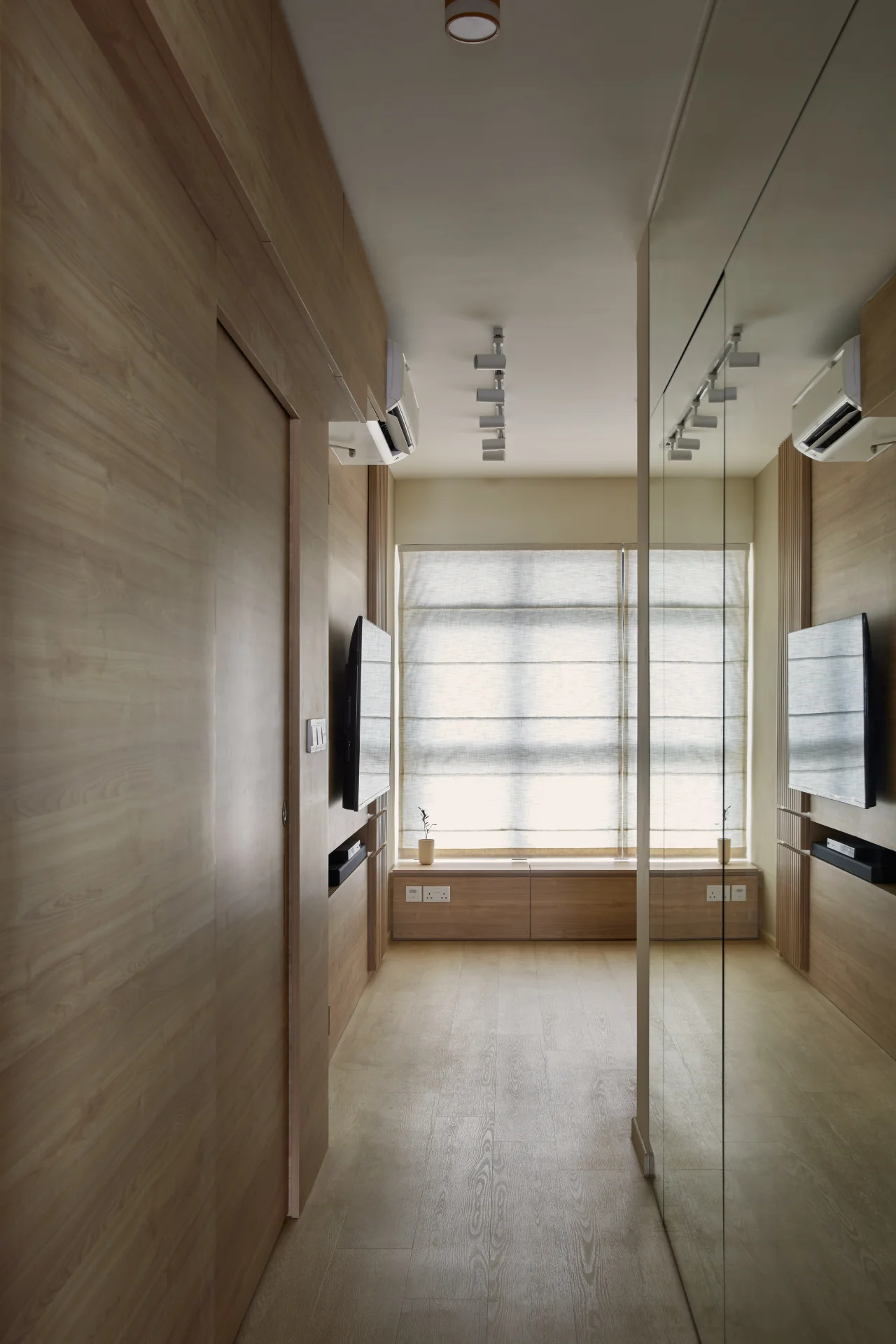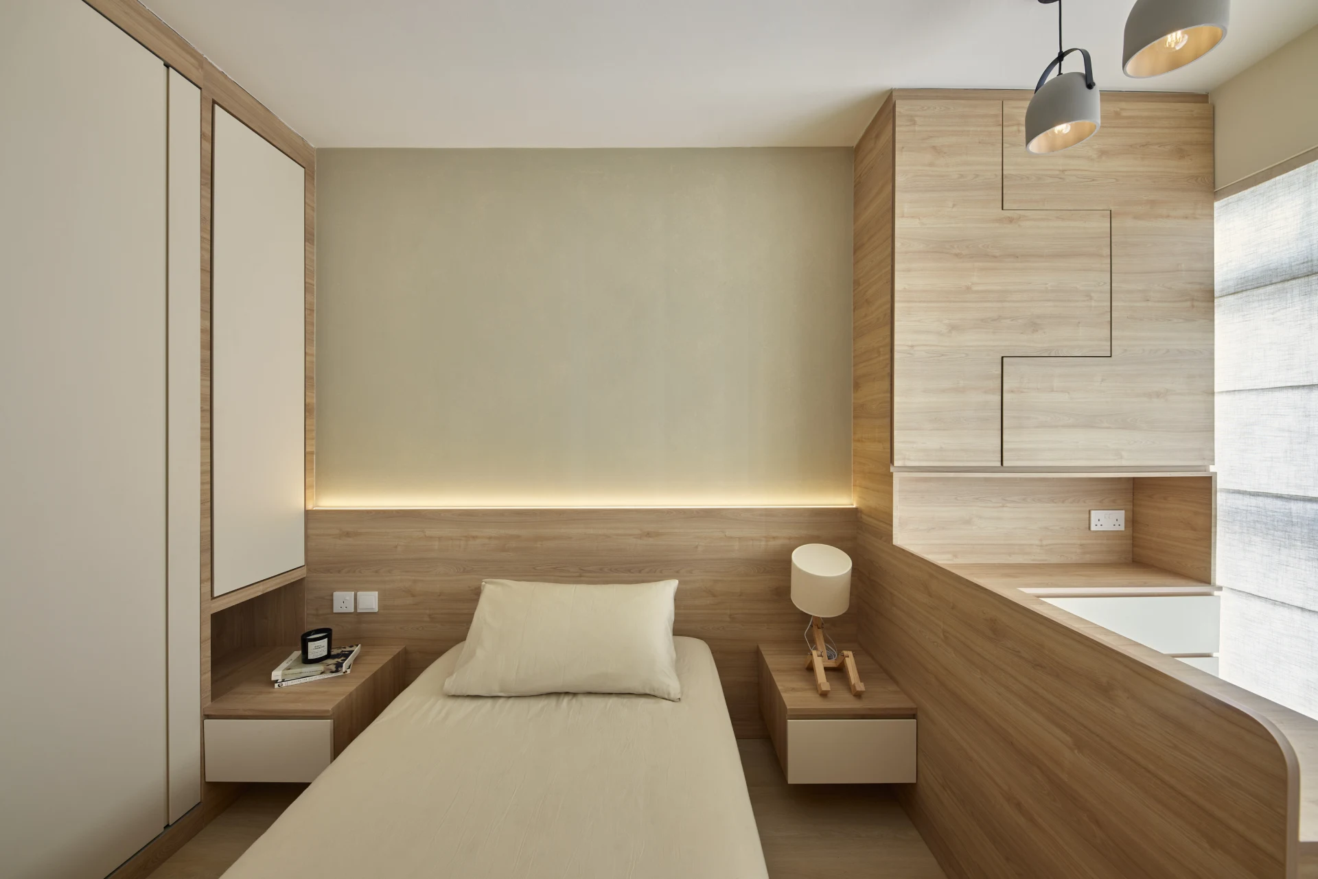 Designed as a peaceful sanctuary for a single occupant, this compact 2-room BTO renovation embraces Scandinavian and Muji sensibilities — soft wood tones, clean-lined built-ins, and smart multi-functional use of space.