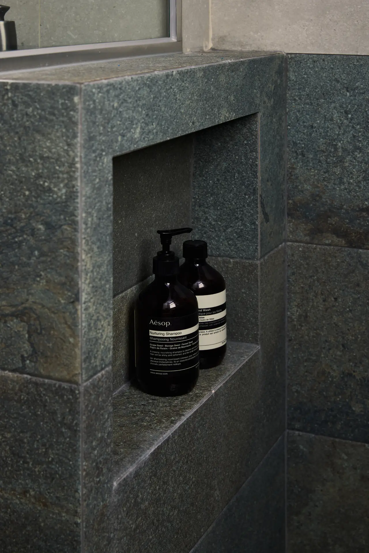 In the bathroom, textured stone-look tiles in slate green contrast with smooth beige walls, bringing a serene, almost spa-like quality to the compact layout. A floating vanity with wood-toned drawers completes the Muji-inspired palette.