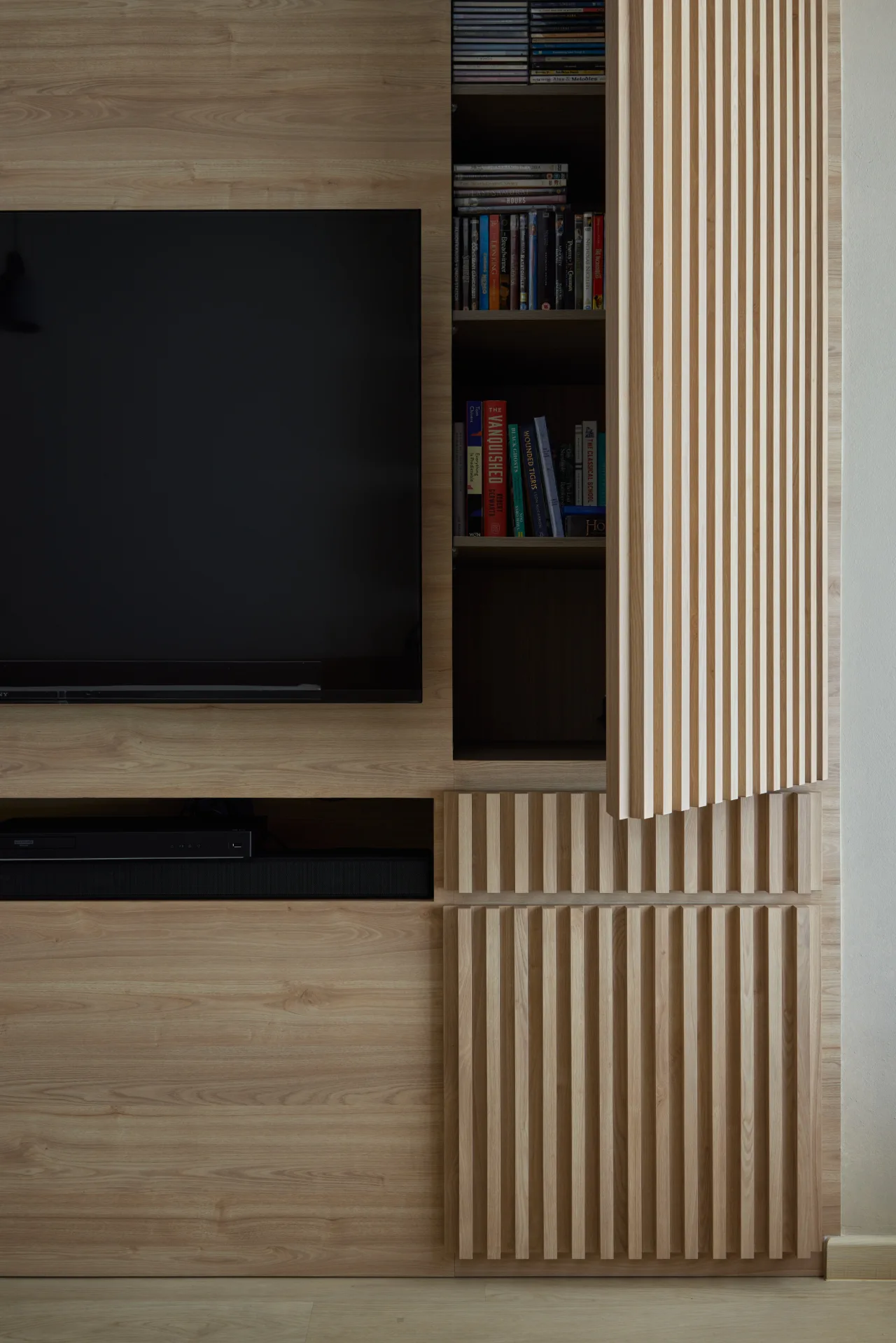 The living area is warm and inviting, centred around a custom TV feature wall with fluted detailing and hidden storage. Opposite, a bookcase and storage settee wraps around the wall forming the dining nook, complemented by a zen circular recessed shelf feature that anchors the dining bench. Both dining and bench seating double up with hidden storage compartments, maintaining clean surfaces while enhancing utility.