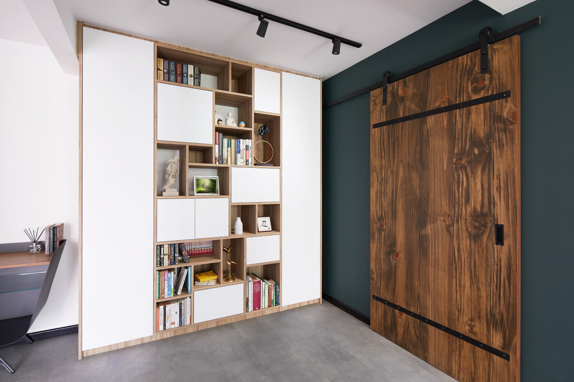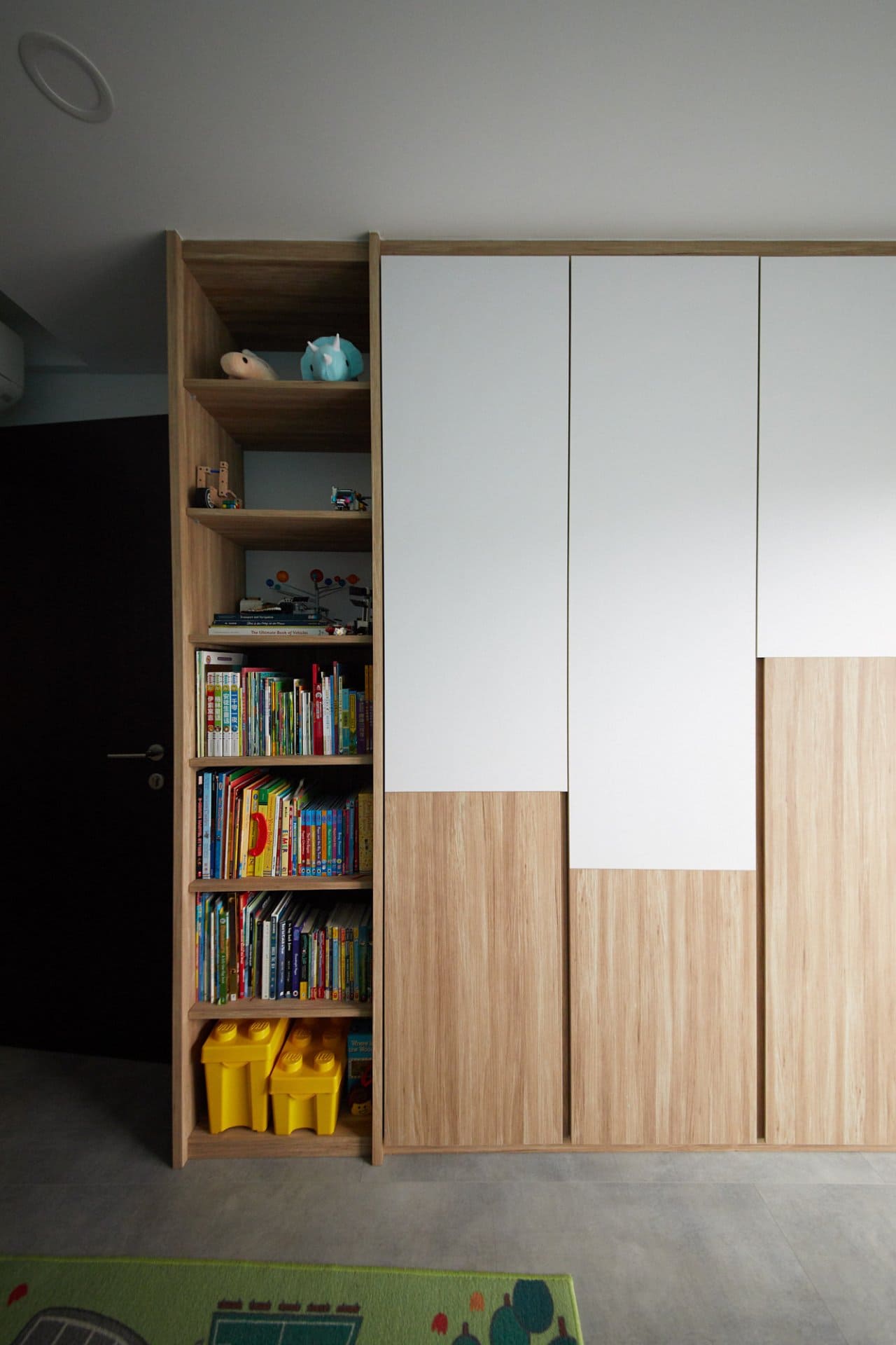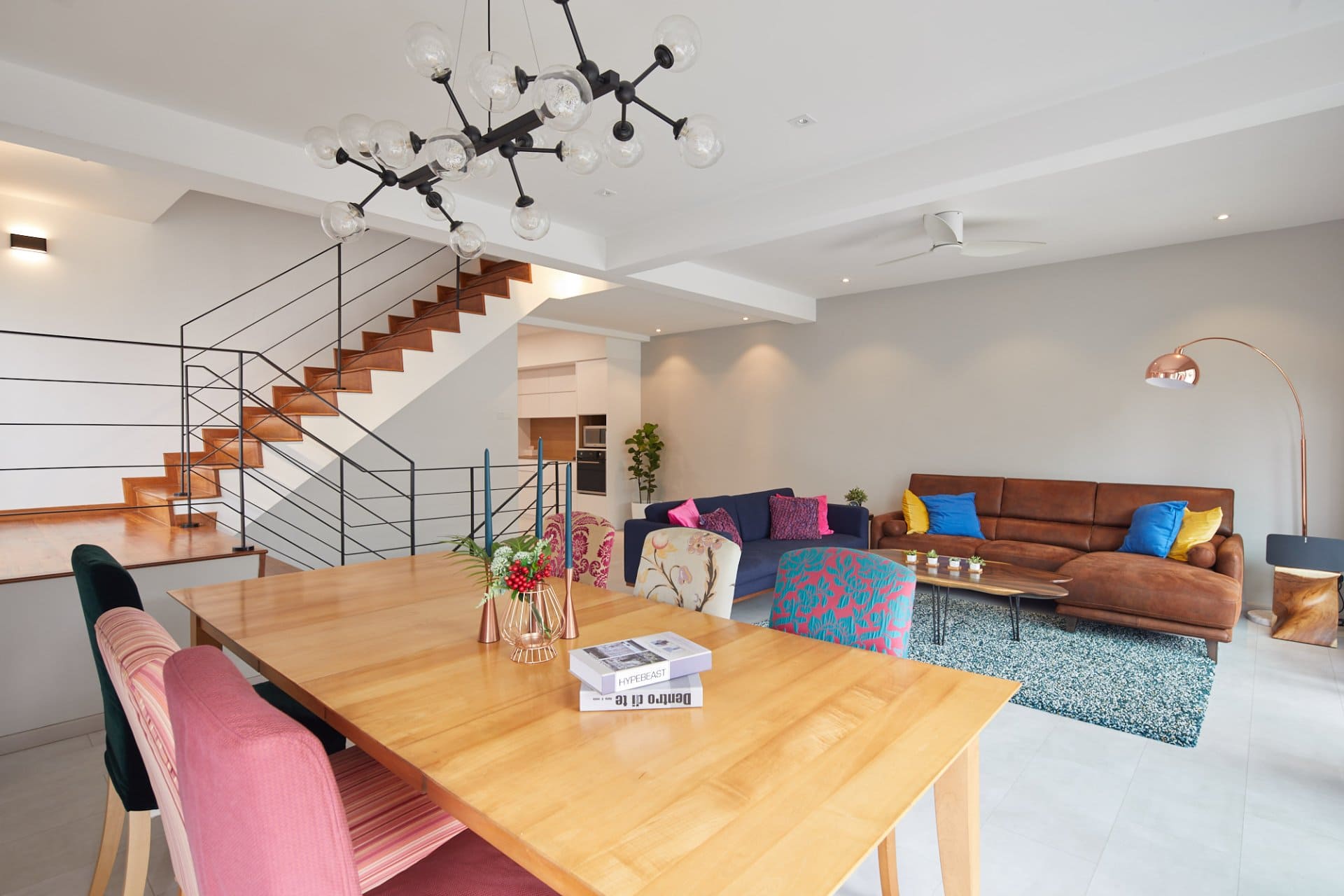 This semi-detached landed home along Yio Chu Kang Road proves that function doesn’t have to mean boring. Designed for a young family, the home is a confident blend of practicality, playfulness, and bold aesthetic choices — from asymmetric shelving to vivid textiles and sculptural wood furniture.