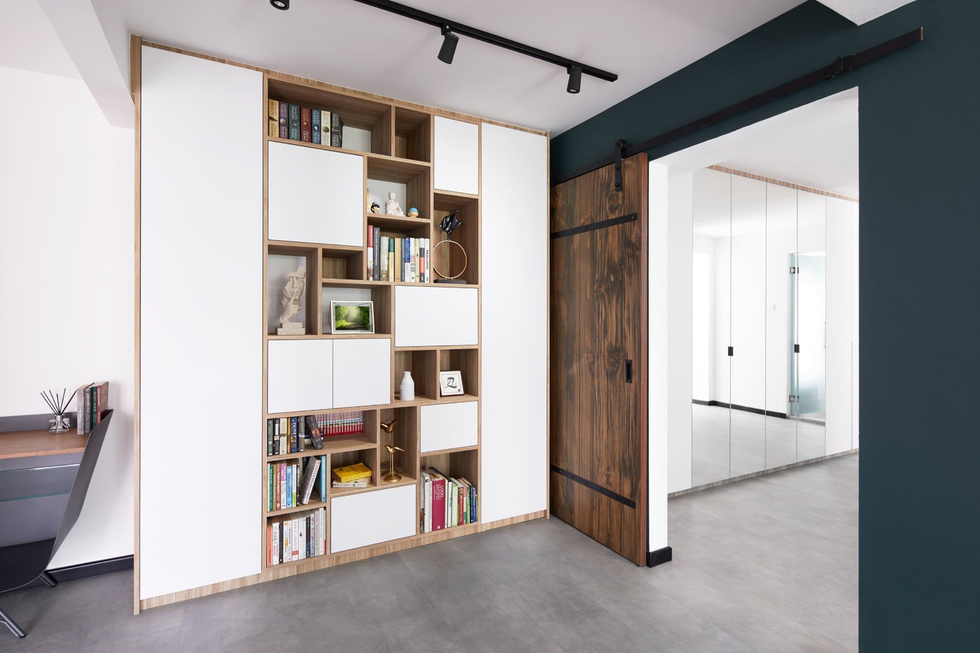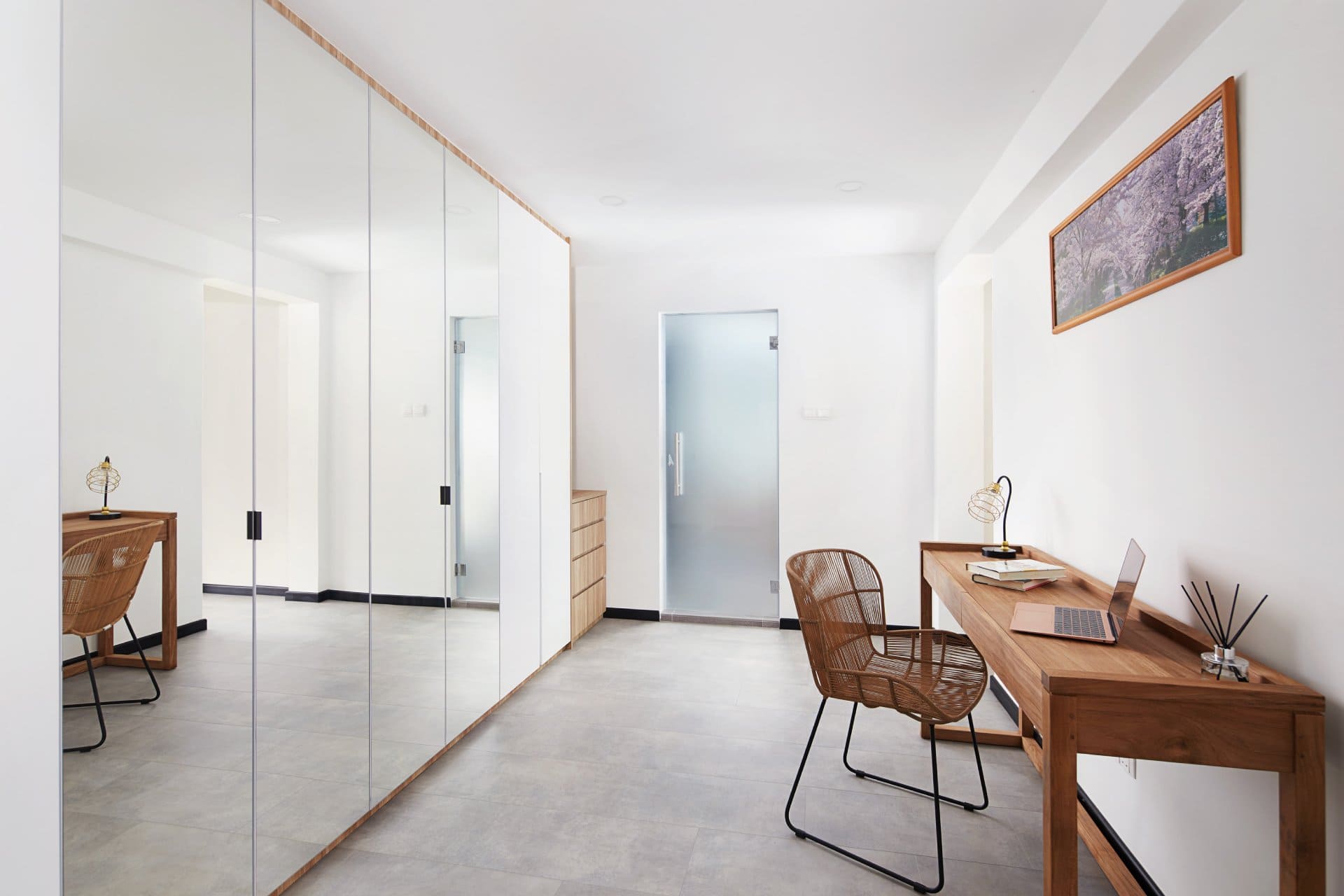 The walk-in wardrobe takes on a fresh identity as a multifunctional dressing and study area. Mirrored wardrobe doors reflect light and space, visually expanding the narrow room, while a slim desk and chair offer workspace functionality.