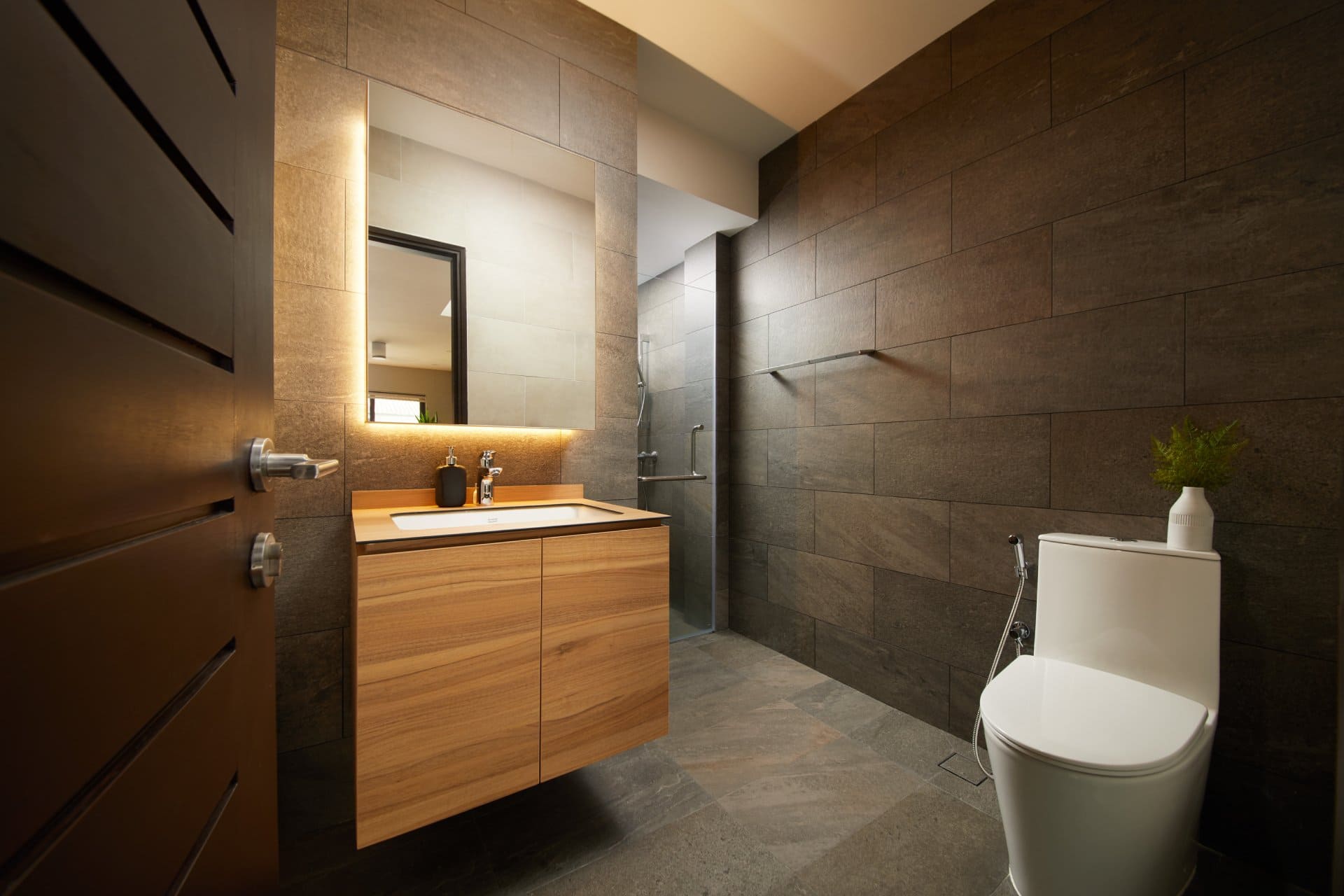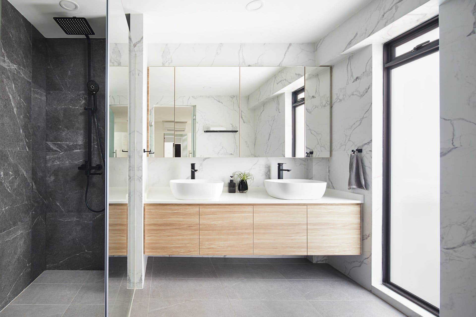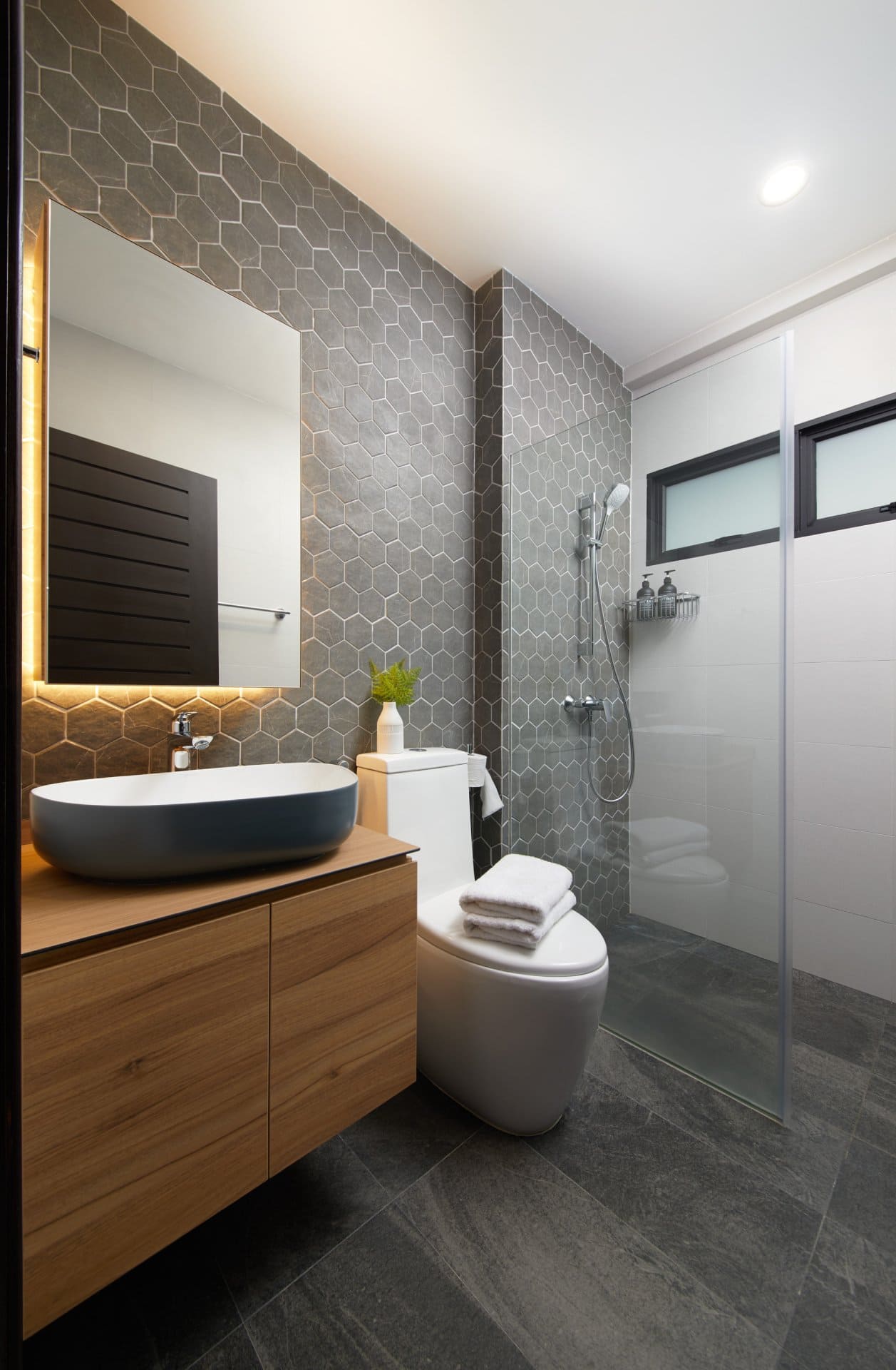The bathrooms reflect elevated material use — the common bath features a sleek grey palette of honeycomb tiles warmed with wood, while the master bath layers marble-inspired finishes and dual sinks beneath a floating vanity. A junior bathroom embraces patterned tiles and a soft, warm glow from a backlit mirror, creating a welcoming daily retreat.