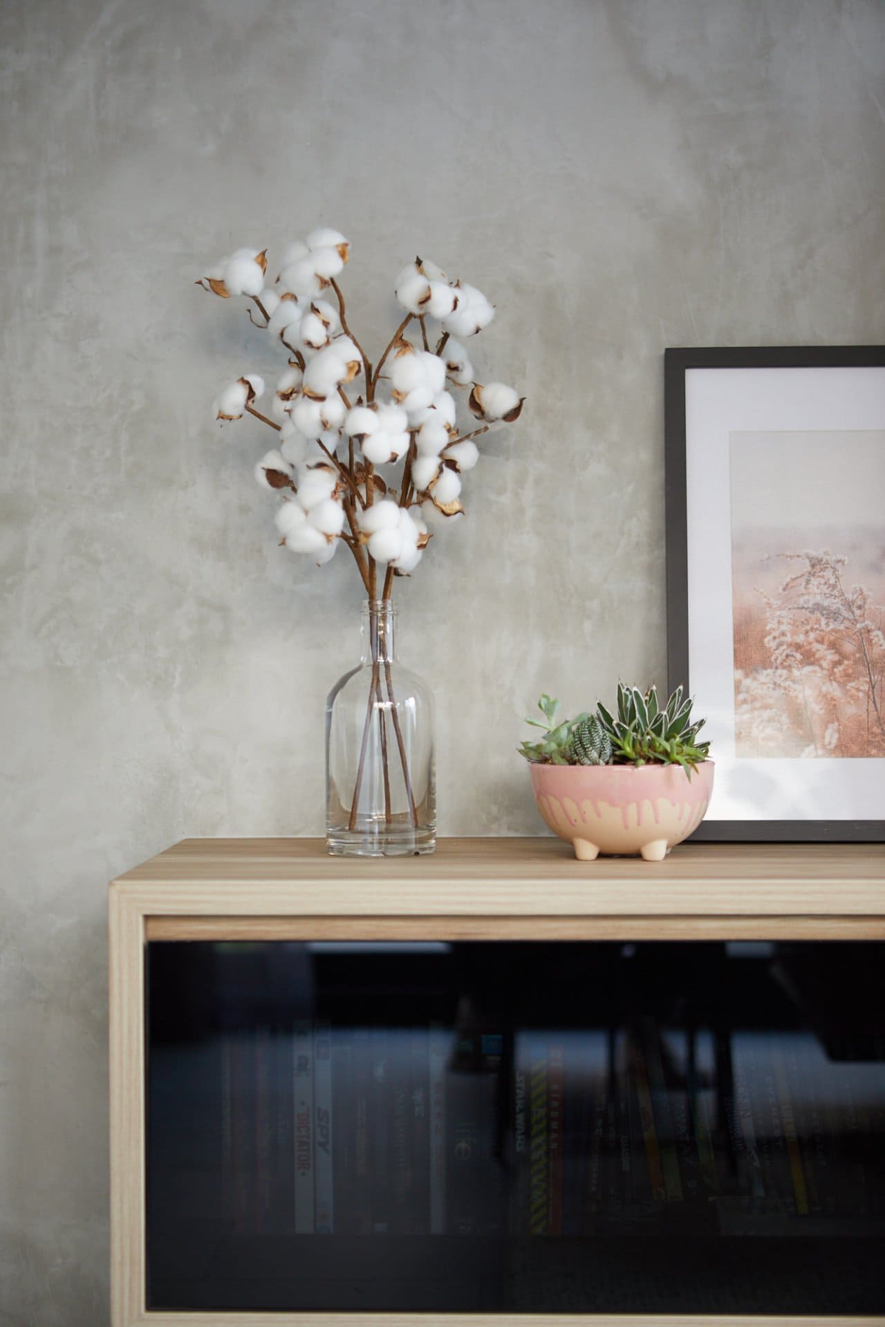 Natural light floods through the full height glass doors to a bright, open-plan ground floor living room where white walls and ceilings serve as a crisp canvas for layered textures and pops of colour.