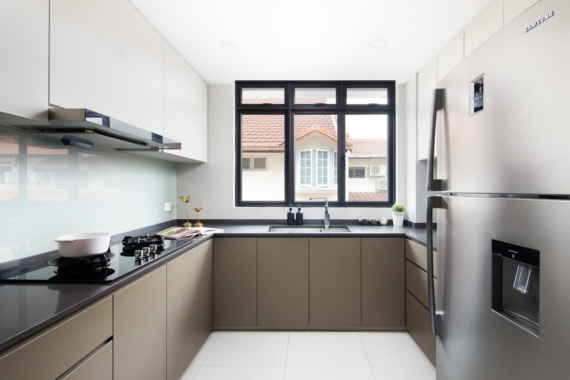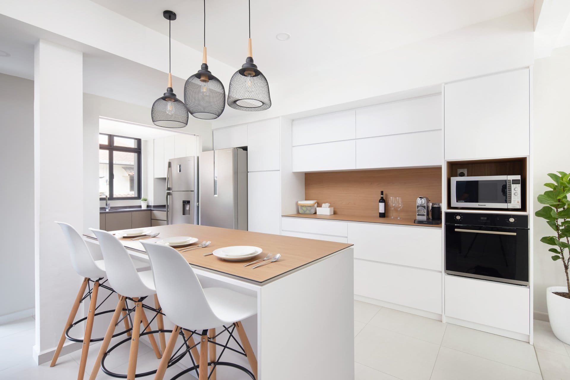 The dry kitchen is sleek and efficient in white and soft browns, contrasted with black and metallic elements for a sleek edge. A kitchen island with high chair seating doubles as a casual breakfast bar and social hub. Just beyond, an open living and dining space creates flow across the main level, punctuated with quirky, mismatched chairs that add a youthful spirit and pop of colour.